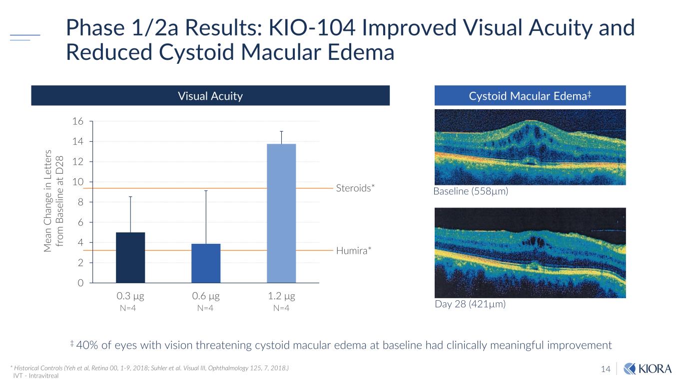 13 KIO-104 Phase 1/2a Results Safety & Tolerability ✓ No SAE ✓ Excellent tolerability at all doses Pharmacokinetics ✓ KIO-100 was not detected in the peripheral blood at any time
