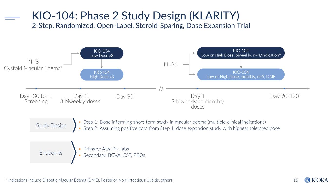 14 Phase 1/2a Results: KIO-104 Improved Visual Acuity and Reduced Cystoid Macular Edema * Historical Controls (Yeh et al, Retina 00, 1-9, 2018; Suhler et al. Visual III, Ophthalmology 125, 7, 2018.) IVT - Intravitreal 0 2 4 6 8 10 12 14 16 0.3 μg 0.6 μg 1.2 μg Steroids* Humira*M ea n C ha ng e in L et te rs fr om B as el in e at D 28 N=4 N=4 N=4 Visual Acuity Day 28 (421µm) Baseline (558µm) Cystoid Macular Edema‡ ‡ 40% of eyes with vision threatening cystoid macular edema at baseline had clinically meaningful improvement