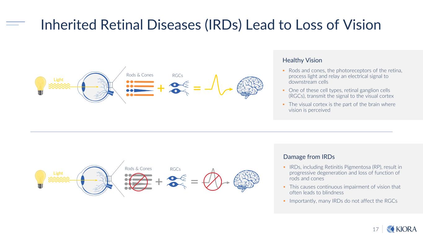 17 Inherited Retinal Diseases (IRDs) Lead to Loss of Vision Healthy Vision Rods and cones, the photoreceptors of the retina, process light and relay an electrical signal to downstream cells One of these cell types, retinal ganglion cells (RGCs), transmit the signal to the visual cortex The visual cortex is the part of the brain where vision is perceived Damage from IRDs IRDs, including Retinitis Pigmentosa (RP), result in progressive degeneration and loss of function of rods and cones This causes continuous impairment of vision that often leads to blindness Importantly, many IRDs do not affect the RGCs Rods & Cones Light RGCs Rods & Cones Light RGCs