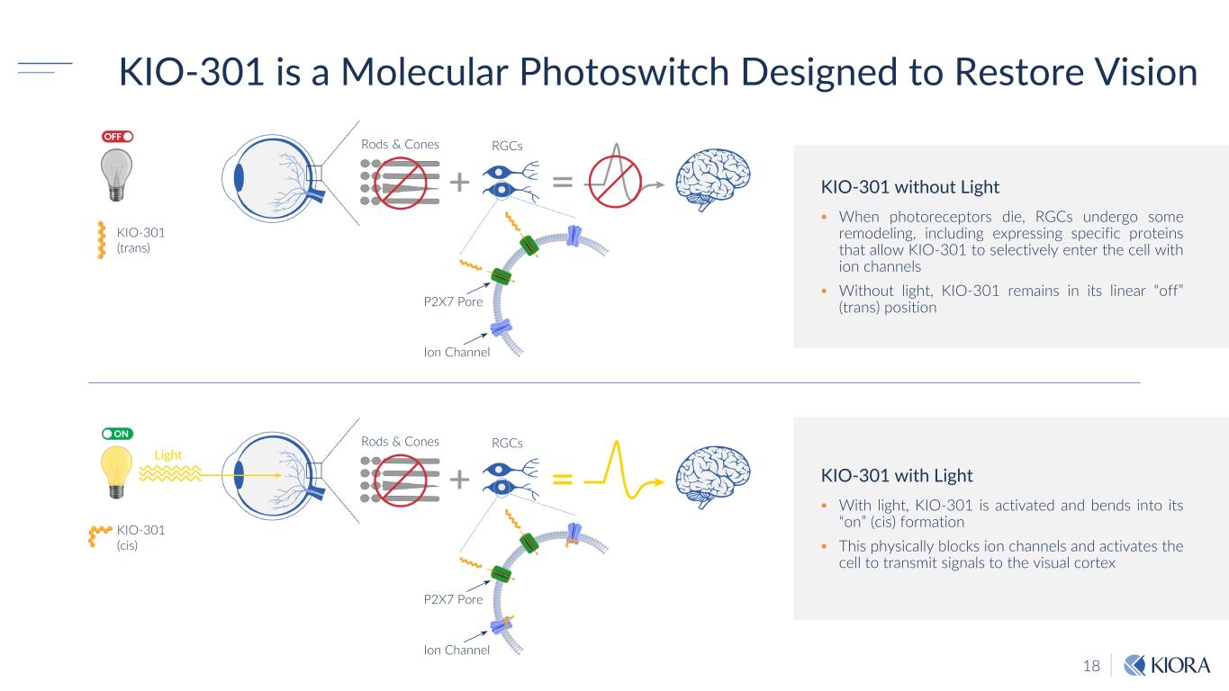 KIO-301 targets and enters specialized cells of the retina (retinal ganglion cells or RGCs) that are located ‘downstream’ of degenerated rods and cones, the cells normally responsible for converting light to vision. KIO-301, when inside RGCs, is activated by visible light and confers light-sensing capabilities by altering the flow of ions in and out of the cell, thus giving RGCs the ability to facilitate visual processing. This is a reversible process allowing turning on and off the RGCs in the presence and absence of light.