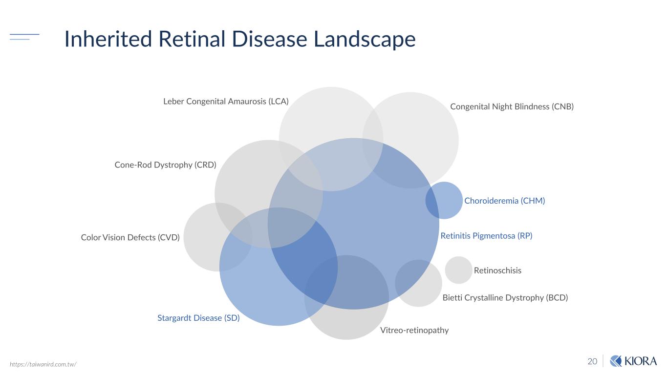 20https://taiwanird.com.tw/ Inherited Retinal Disease Landscape Leber Congenital Amaurosis (LCA) Cone-Rod Dystrophy (CRD) Color Vision Defects (CVD) Stargardt Disease (SD) Vitreo-retinopathy Bietti Crystalline Dystrophy (BCD) Retinoschisis Choroideremia (CHM) Congenital Night Blindness (CNB) Retinitis Pigmentosa (RP)