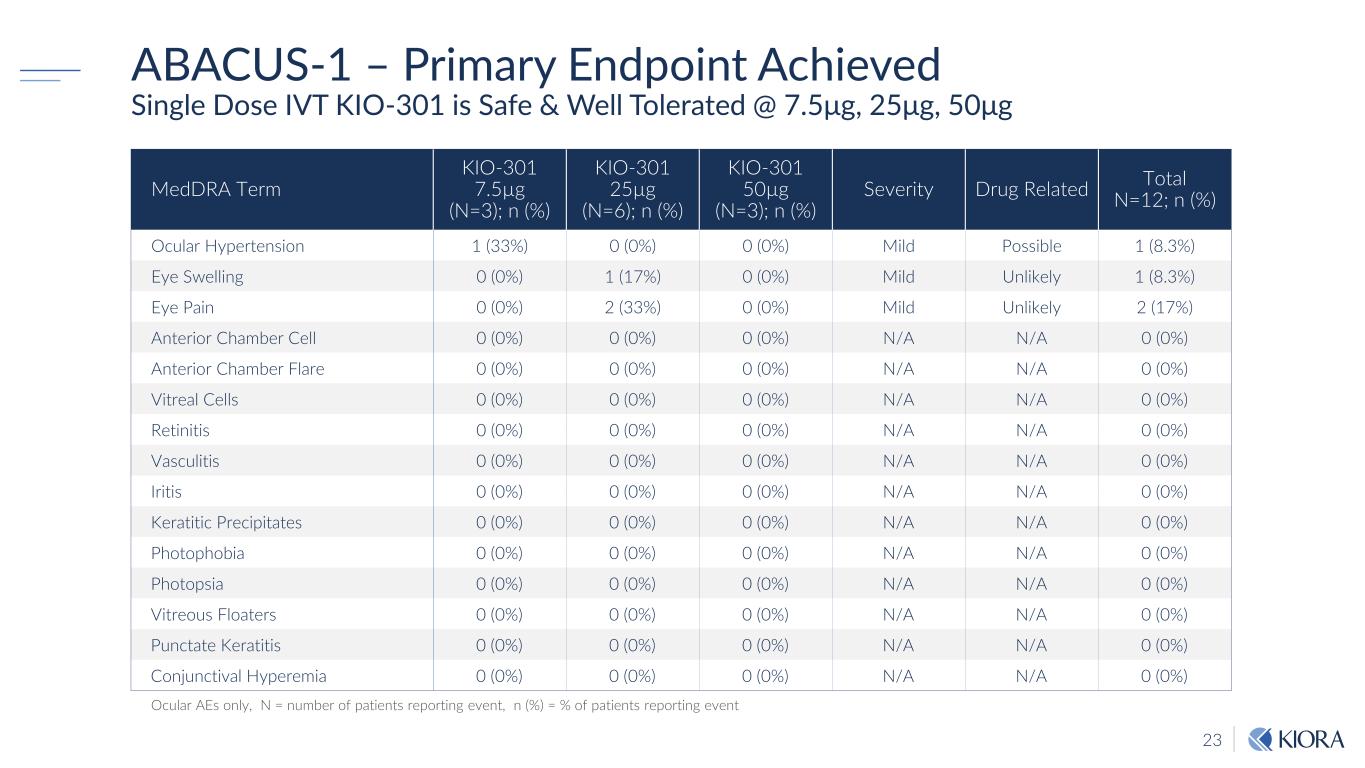 22 KIO-301: Phase 1b Study Design (ABACUS) Open Label, Single Ascending Dose Trial – 2 Sites (Australia) Two Cohorts, non-randomized, open-label, single IVT injection per eye Cohort 1 – NLP/BLP patients; Cohort 2 – HM/CF patients Primary – AEs, PK & labs Secondary – Assessment days (shown only for Cohort 1 above) is repeated for each cohort per eye; intensity & contrast assessment, kinetic perimetry, functional MRI, etc. Safety review conducted by Investigators between after sentinel subject Study Design Endpoints Review N=6 3/cohort Binocular Day 90 Cohort 1: KIO-301 (7.5 µg) Day -30 to -2 Visit 1-Screening Day 29-30 Visit 5 Day 60 Day 120 Cohort 1: KIO-301 Contralateral (25 µg) Cohort 2: KIO-301 (25 µg) Cohort 2: KIO-301 Contralateral (50 µg) Day 1-3 Visit 2 Day 7-8 Visit 3 Day 14-15 Visit 4 Day -120 to -30 fMRI feasibility NLP – No Light Perception, BLP – Bare Light Perception, HM – Hand Motion, CF – Counting Fingers