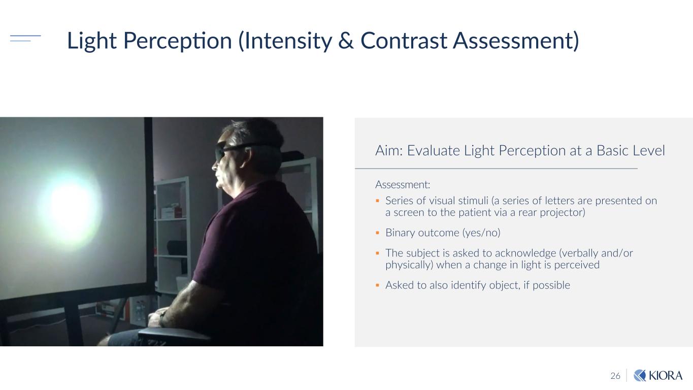 26 Light Perception (Intensity & Contrast Assessment) Assessment: Series of visual stimuli (a series of letters are presented on a screen to the patient via a rear projector) Binary outcome (yes/no) The subject is asked to acknowledge (verbally and/or physically) when a change in light is perceived Asked to also identify object, if possible Aim: Evaluate Light Perception at a Basic Level