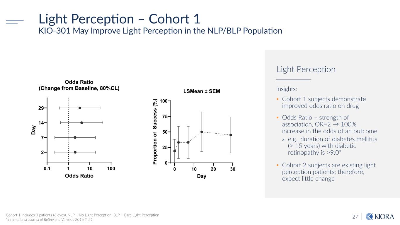 27 Light Perception – Cohort 1 KIO-301 May Improve Light Perception in the NLP/BLP Population Insights: Cohort 1 subjects demonstrate improved odds ratio on drug Odds Ratio – strength of association, OR=2 → 100% increase in the odds of an outcome > e.g., duration of diabetes mellitus (> 15 years) with diabetic retinopathy is >9.0* Cohort 2 subjects are existing light perception patients; therefore, expect little change Light Perception Cohort 1 includes 3 patients (6 eyes), NLP – No Light Perception, BLP – Bare Light Perception *International Journal of Retina and Vitreous 2016:2, 21 0 10 20 30 0 25 50 75 100 LSMean ± SEM Day Pr op or tio n of S uc ce ss (% ) 0.1 1 10 100 2 7 14 29 Odds Ratio (Change from Baseline, 80%CL) Odds Ratio Da y