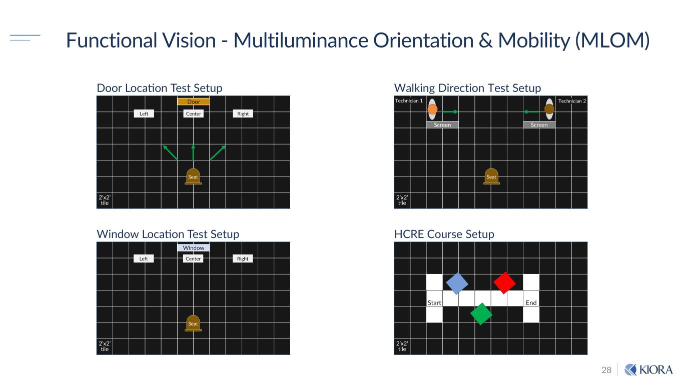 28 2’x2’ tile Door Location Test Setup Functional Vision - Multiluminance Orientation & Mobility (MLOM) 2’x2’ tile Window Location Test Setup 2’x2’ tile Walking Direction Test Setup Start End 2’x2’ tile HCRE Course Setup Screen Screen Technician 1 Technician 2Door Window Left Center Right Left Center Right Seat Seat Seat