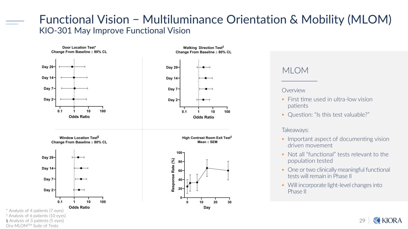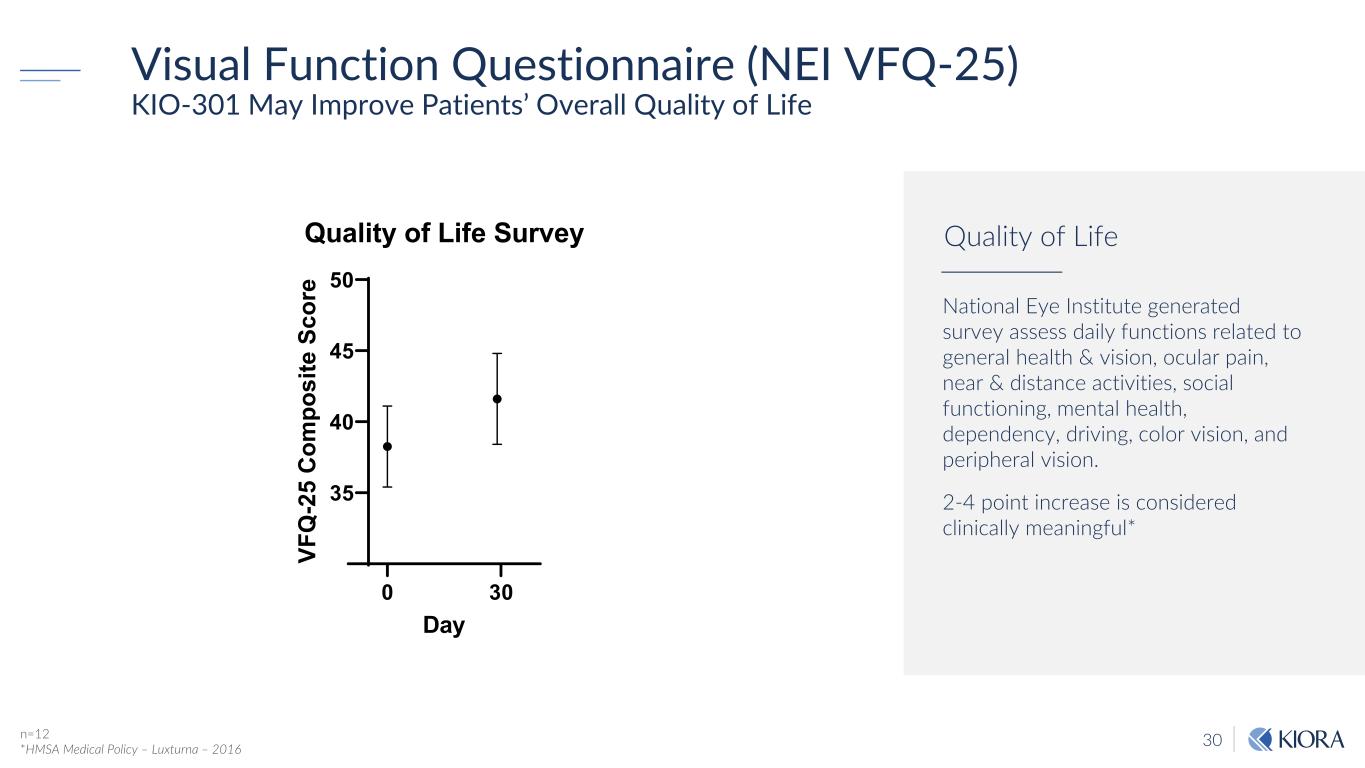 29 Functional Vision − Multiluminance Orientation & Mobility (MLOM) KIO-301 May Improve Functional Vision 0.1 1 10 100 Day 2 Day 7 Day 14 Day 29 Door Location Test* Change From Baseline ± 80% CL Odds Ratio 0.1 1 10 100 Day 2 Day 7 Day 14 Day 29 Walking Direction Test‡ Change From Baseline ± 80% CL Odds Ratio 0.1 1 10 100 Day 2 Day 7 Day 14 Day 29 Window Location Test§ Change From Baseline ± 80% CL Odds Ratio * Analysis of 4 patients (7 eyes) ‡ Analysis of 6 patients (10 eyes) § Analysis of 3 patients (5 eyes) Ora-MLOMTM Suite of Tests Overview First time used in ultra-low vision patients Question: “Is this test valuable?” Takeaways: Important aspect of documenting vision driven movement Not all “functional” tests relevant to the population tested One or two clinically meaningful functional tests will remain in Phase II Will incorporate light-level changes into Phase II MLOM 0 10 20 30 0 20 40 60 80 100 High Contrast Room Exit Test‡ Mean ± SEM Day R es po ns e R at e (% )