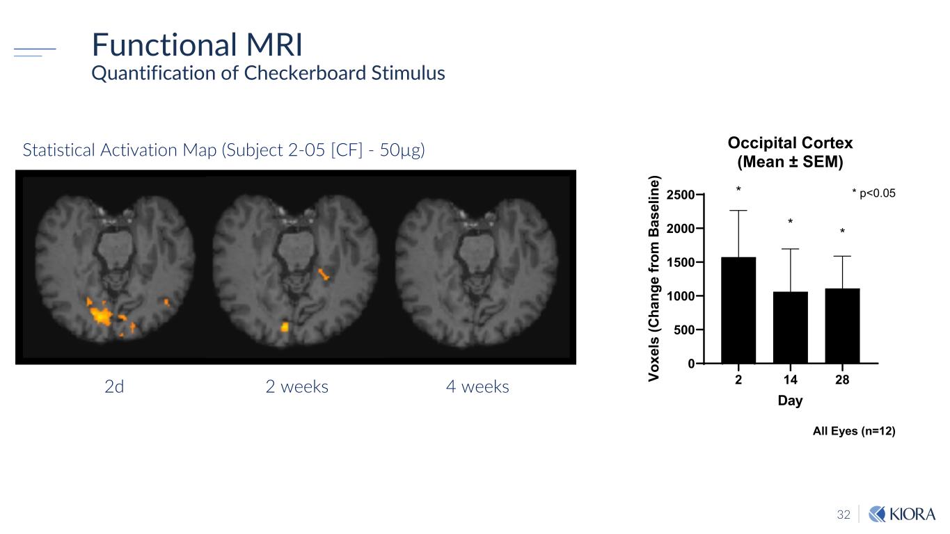 32 1-02 Checkerboard with arrow Statistical Activation Map (Subject 2-05 [CF] - 50µg) 2d 4 weeks2 weeks Functional MRI Quantification of Checkerboard Stimulus 2 14 28 0 500 1000 1500 2000 2500 Occipital Cortex (Mean ± SEM) Day Vo xe ls (C ha ng e fro m B as el in e) * * * * p<0.05 All Eyes (n=12)