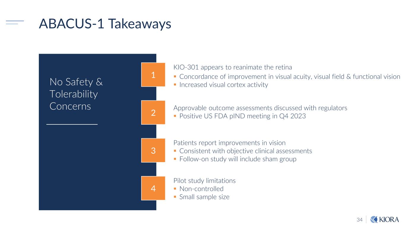 33 “…in my last few months and years, my vision has been deteriorating fairly rapidly. It’s like a dimmer switch has been turned down and the rooms were getting darker. Going into areas would be like going into a cave. In my living room, there are two lights in the ceiling, cluster lights. I would have to look to find one, then look to find the other. When I sat down three days after the injection, I looked up and I could see both quite clearly and with better illumination (brightness)…” ~ Subject 1-03 - Baseline HM Patient Testimonials NLP – No Light Perception, HM – Hand Motion, CF – Counting Fingers Videos available at https://kiorapharma.com/inherited-retinal-diseases/ “Before the study, I had no light perception whatsoever. And at the start of the study, I had a couple of MRIs; and while I was there, they flashed lights there and I saw absolutely nothing. 48 hours after the drug, I had another MRI; and I think that was the first OMG moment, to say, that I can actually see flashing lights.” “We went for a walk, a couple of weeks ago, into the supermarket, and I thought I was in a sci-fi movie. I could see everything, and I could see every individual item which I would not have been able to do…”