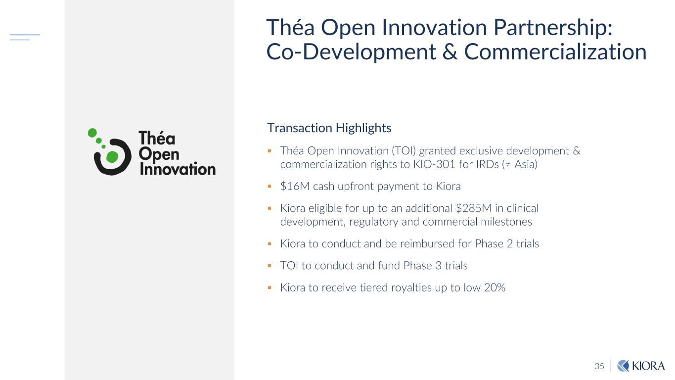 34 ABACUS-1 Takeaways Patients report improvements in vision Consistent with objective clinical assessments Follow-on study will include sham group Pilot study limitations Non-controlled Small sample size Approvable outcome assessments discussed with regulators Positive US FDA pIND meeting in Q4 2023 KIO-301 appears to reanimate the retina Concordance of improvement in visual acuity, visual field & functional vision Increased visual cortex activity 4 3 2 1 No Safety & Tolerability Concerns