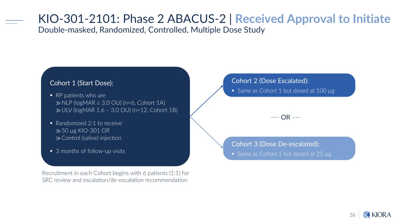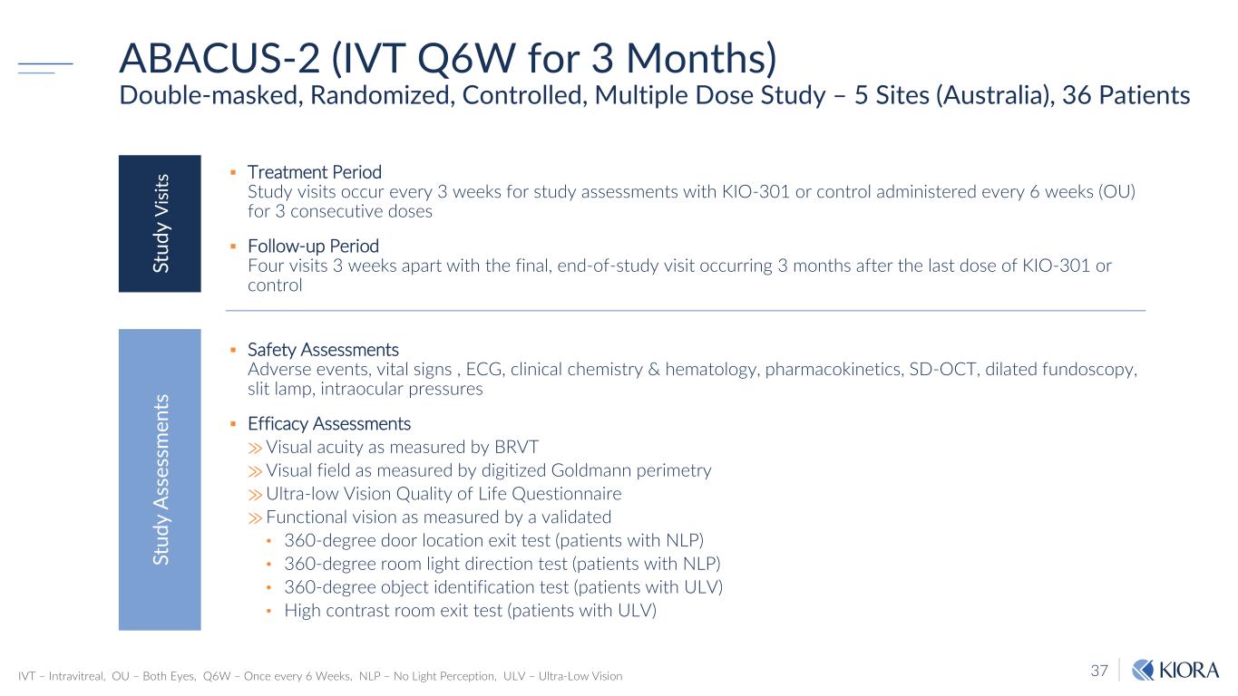 36 KIO-301-2101: Phase 2 ABACUS-2 | Received Approval to Initiate Double-masked, Randomized, Controlled, Multiple Dose Study Recruitment in each Cohort begins with 6 patients (1:1) for SRC review and escalation/de-escalation recommendation Cohort 2 (Dose Escalated): Same as Cohort 1 but dosed at 100 µg Cohort 1 (Start Dose): RP patients who are ⨠NLP (logMAR ≥ 3.0 OU) (n=6, Cohort 1A) ⨠ULV (logMAR 1.6 – 3.0 OU) (n=12, Cohort 1B) Randomized 2:1 to receive ⨠50 µg KIO-301 OR ⨠Control (saline) injection 3 months of follow-up visits Cohort 3 (Dose De-escalated): Same as Cohort 1 but dosed at 25 µg --- OR ---