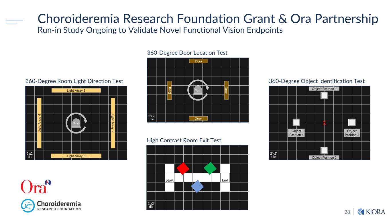 38 Choroideremia Research Foundation Grant & Ora Partnership Run-in Study Ongoing to Validate Novel Functional Vision Endpoints 2’x2’ tile 360-Degree Door Location Test Door Door D oorD oo r Start End 2’x2’ tile High Contrast Room Exit Test 2’x2’ tile 360-Degree Room Light Direction Test Light Array 2 Light Array 1 Li gh t A rr ay 4 Light Array 3 Seat 2’x2’ tile 360-Degree Object Identification Test Object Position 1 Object Position 3 Object Position 2 Object Position 4 Seat X