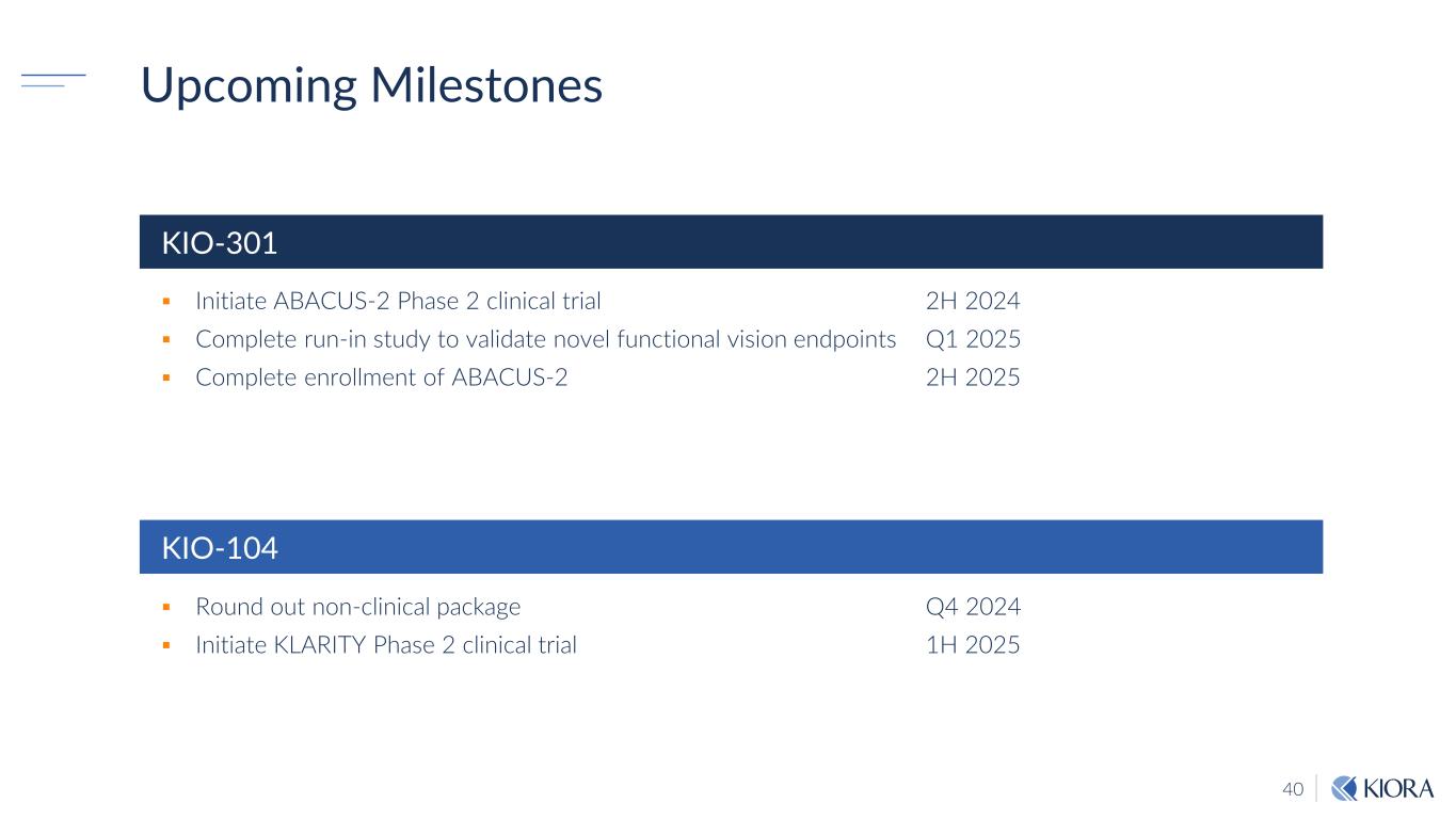 40 Upcoming Milestones Initiate ABACUS-2 Phase 2 clinical trial 2H 2024 Complete run-in study to validate novel functional vision endpoints Q1 2025 Complete enrollment of ABACUS-2 2H 2025 KIO-301 KIO-104 Round out non-clinical package Q4 2024 Initiate KLARITY Phase 2 clinical trial 1H 2025