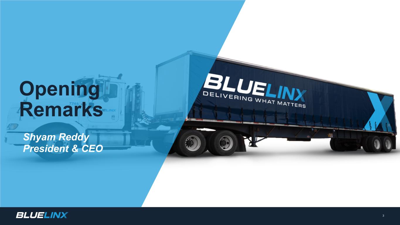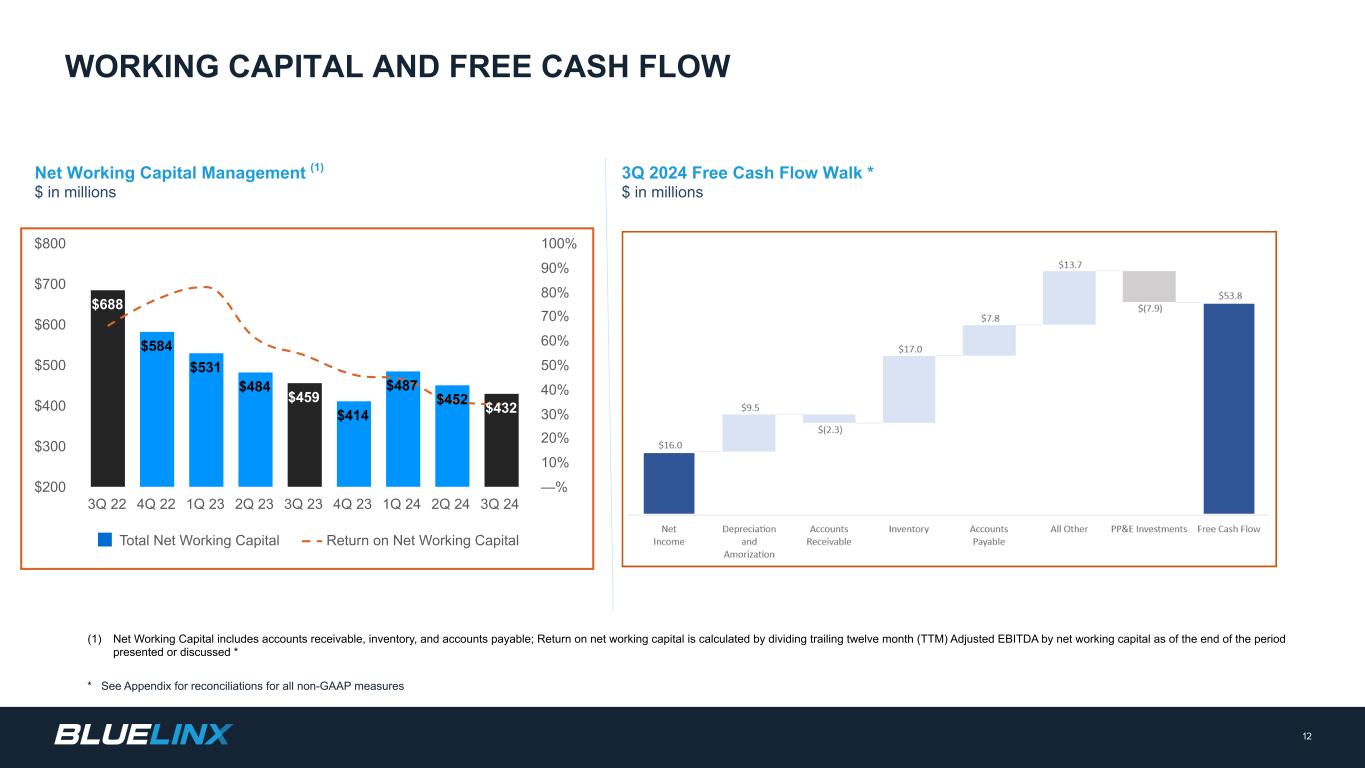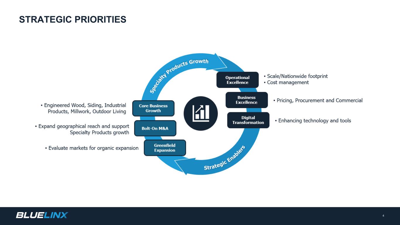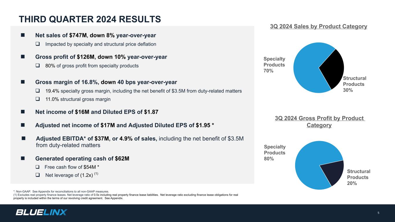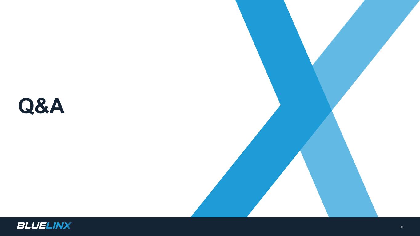 The Company reports its financial results in accordance with GAAP. The Company also believes that presentation of certain non-GAAP measures may be useful to investors and may provide a more complete understanding of the factors and trends affecting the business than using reported GAAP results alone. Any non-GAAP measures used herein are reconciled to their most directly comparable GAAP measures herein or in the financial tables accompanying this presentation. The Company cautions that non-GAAP measures are not presentations made in accordance with GAAP and are not intended to present superior measures of our financial condition from those measures determined under GAAP. Non-GAAP measures should be considered in addition to, but not as a substitute for, the Company’s reported GAAP results. The Company further cautions that its non-GAAP measures, as used herein, are not necessarily comparable to other similarly titled measures of other companies due to differences in methods of calculation. Adjusted EBITDA and Adjusted EBITDA Margin. BlueLinx defines Adjusted EBITDA as an amount equal to net income (loss) plus interest expense and all interest expense related items, income taxes, depreciation and amortization, and further adjusted for certain non-cash items and other special items, including compensation expense from share based compensation, one-time charges associated with the legal, consulting, and professional fees related to our merger and acquisition activities, gains or losses on sales of properties, amortization of deferred gains on real estate, and expense associated with our restructuring activities, such as severance, in addition to other significant and/or one-time, nonrecurring, non-operating items. The Company presents Adjusted EBITDA because it is a primary measure used by management to evaluate operating performance. Management believes this metric helps to enhance investors’ overall understanding of the financial performance and cash flows of the business. Management also believes Adjusted EBITDA is helpful in highlighting operating trends. Adjusted EBITDA is frequently used by securities analysts, investors, and other interested parties in their evaluation of companies, many of which present an Adjusted EBITDA measure when reporting their results. We determine our Adjusted EBITDA Margin, which we sometimes refer to as our Adjusted EBITDA as a percentage of net sales, by dividing our Adjusted EBITDA for the applicable period by our net sales for the applicable period. We believe that this ratio is useful to investors because it more clearly defines the quality of earnings and operational efficiency of translating sales to profitability. Adjusted Net Income and Adjusted Earnings Per Share. BlueLinx defines Adjusted Net Income as net income adjusted for certain non-cash items and other special items, including compensation expense from share based compensation, one-time charges associated with the legal, consulting, and professional fees related to our merger and acquisition activities, gains or losses on sales of properties, amortization of deferred gains on real estate, and expense associated with our restructuring activities, such as severance, in addition to other significant and/or one-time, nonrecurring, non-operating items, further adjusted for the tax impacts of such reconciling items. BlueLinx defines Adjusted Earnings Per Share (basic and/or diluted) as the Adjusted Net Income for the period divided by the weighted average outstanding shares (basic and/or diluted) for the periods presented. We believe that Adjusted Net Income and Adjusted Earnings Per Share (basic and/or diluted) are useful to investors to enhance investors’ overall understanding of the financial performance of the business. Management also believes Adjusted Net Income and Adjusted Earnings Per Share (basic and/or diluted) are helpful in highlighting operating trends. Free Cash Flow. BlueLinx defines free cash flow as net cash provided by operating activities less total capital expenditures. Free cash flow is a measure used by management to assess our financial performance, and we believe it is useful for investors because it relates the operating cash flow of the Company to the capital that is spent to continue and improve business operations. In particular, free cash flow indicates the amount of cash generated after capital expenditures that can be used for, among other things, investment in our business, strengthening our balance sheet, and repayment of our debt obligations. Free cash flow does not represent the residual cash flow available for discretionary expenditures since there may be other nondiscretionary expenditures that are not deducted from the measure. Net Debt, Net Debt Excluding Real Property Finance Lease Liabilities, Overall Net Leverage Ratio, and Net Leverage Ratio Excluding Real Property Finance Lease Liabilities. BlueLinx calculates Net Debt as its total short- and long-term debt, including outstanding balances under our term loan and revolving credit facility and the total amount of its obligations under finance leases, less cash and cash equivalents. Net Debt Excluding Real Property Finance Lease Liabilities is calculated in the same manner as Net Debt, except the total amount of obligations under real estate finance leases are excluded. Although our credit agreements do not contain leverage covenants, a net leverage ratio excluding finance lease obligations for real property is included within the terms of our revolving credit agreement. We believe that Net Debt and Net Debt Excluding Real Property Finance Lease Liabilities are useful to investors because our management reviews both metrics as part of its management of overall liquidity, financial flexibility, capital structure and leverage, and creditors and credit analysts monitor our net debt as part of their assessments of our business. We determine our Overall Net Leverage Ratio by dividing our Net Debt by Twel
