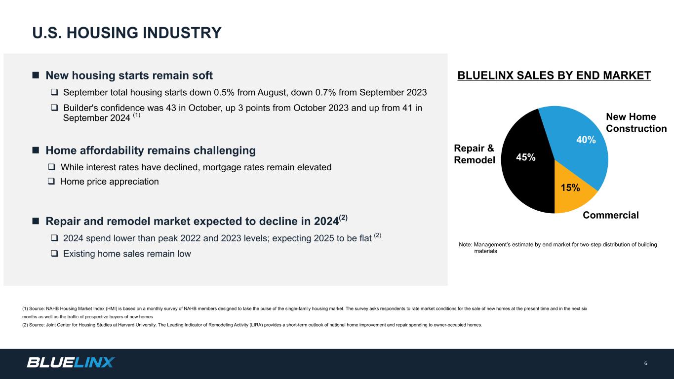 n Net sales of $747M, down 8% year-over-year q Impacted by specialty and structural price deflation n Gross profit of $126M, down 10% year-over-year q 80% of gross profit from specialty products n Gross margin of 16.8%, down 40 bps year-over-year q 19.4% specialty gross margin, including the net benefit of $3.5M from duty-related matters q 11.0% structural gross margin n Net income of $16M and Diluted EPS of $1.87 n Adjusted net income of $17M and Adjusted Diluted EPS of $1.95 * n Adjusted EBITDA* of $37M, or 4.9% of sales, including the net benefit of $3.5M from duty-related matters n Generated operating cash of $62M q Free cash flow of $54M * q Net leverage of (1.2x) (1) *: Non-GAAP. See Appendix for reconciliations to all non-GAAP measures. (1) Excludes real property finance leases. Net leverage ratio of 0.5x including real property finance lease liabilities. Net leverage ratio excluding finance lease obligations for real property is included within the terms of our revolving credit agreement. See Appendix. Explosive profitable growth with a highly engaged team 5 THIRD QUARTER 2024 RESULTS 3Q 2024 Sales by Product Category Specialty Products 70% Structural Products 30% 3Q 2024 Gross Profit by Product Category Specialty Products 80% Structural Products 20%