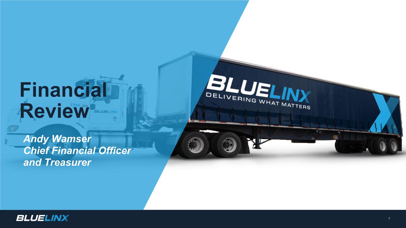 n New housing starts remain soft q September total housing starts down 0.5% from August, down 0.7% from September 2023 q Builder's confidence was 43 in October, up 3 points from October 2023 and up from 41 in September 2024 (1) n Home affordability remains challenging q While interest rates have declined, mortgage rates remain elevated q Home price appreciation n Repair and remodel market expected to decline in 2024(2) q 2024 spend lower than peak 2022 and 2023 levels; expecting 2025 to be flat (2) q Existing home sales remain low Note: Management’s estimate by end market for two-step distribution of building materials (1) Source: NAHB Housing Market Index (HMI) is based on a monthly survey of NAHB members designed to take the pulse of the single-family housing market. The survey asks respondents to rate market conditions for the sale of new homes at the present time and in the next six months as well as the traffic of prospective buyers of new homes (2) Source: Joint Center for Housing Studies at Harvard University. The Leading Indicator of Remodeling Activity (LIRA) provides a short-term outlook of national home improvement and repair spending to owner-occupied homes. 6 U.S. HOUSING INDUSTRY BLUELINX SALES BY END MARKET Repair & Remodel 45% New Home Construction 40% Commercial 15%