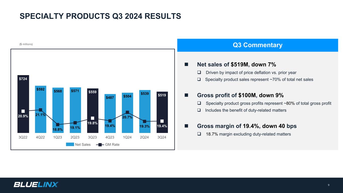 n Net Sales decreased 7.7% to $747M q Specialty product sales decreased 7% q Structural product sales decreased 9% n Gross Margin of 16.8%, down 40 bps q Includes a benefit of approximately $3.5M related to import duties from prior periods n Adjusted Diluted EPS of $1.95 * n Adjusted EBITDA of $37M * q Adjusted EBITDA margin of 4.9% * q Adjusted EBITDA margin of 4.4% excluding duty- related matters n Free Cash Flow of $54M * q Cash Flow from Operations $62M q Capital Expenditures of $8M; finance leases $6M 8 THIRD QUARTER 2024 RESULTS Note: All comparisons versus the prior-year period unless otherwise noted. (1) Excludes real property finance lease liabilities. Net leverage including real property finance lease liabilities was 0.5x and 0.5x for Q3 2024 and Q3 2023, respectively. Net leverage ratio excluding finance lease obligations for real property is included within the terms of our revolving credit agreement. Q3 Commentary $ in millions, except per share data Q3 2024 Q3 2023 Variance Net Sales $747 $810 (7.7)% Gross Profit $126 $139 (9.8)% Gross Margin % 16.8% 17.2% (40) bps Adjusted Net Income * $17 $27 (37.8)% Adjusted Diluted EPS * $1.95 $2.98 (34.6)% Adjusted EBITDA * $37 $50 (27.3)% Adjusted EBITDA % * 4.9% 6.2% (130) bps Free Cash Flow * $54 $73 ($19) Net Leverage (1) (1.2x) (0.6x) (0.6x) * Non-GAAP. See Appendix for reconciliations for all non-GAAP measures