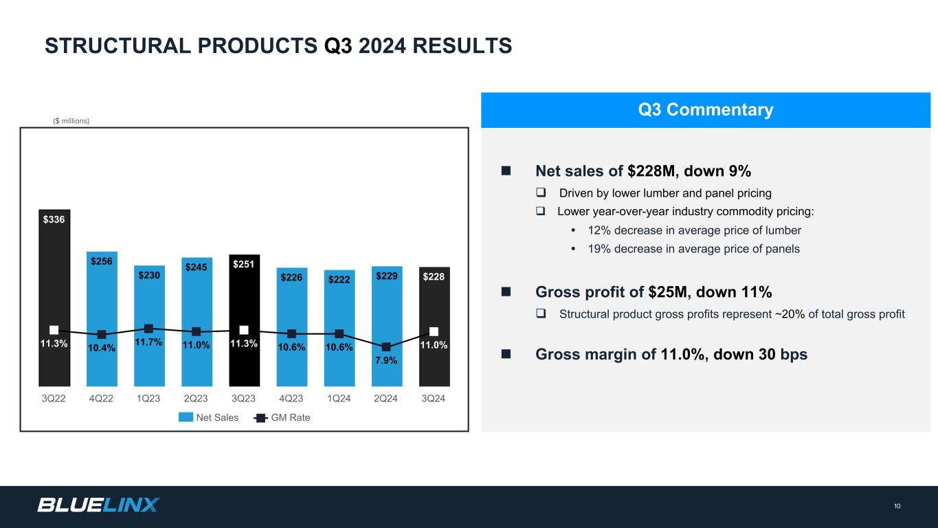 ($ millions) n Net sales of $519M, down 7% q Driven by impact of price deflation vs. prior year q Specialty product sales represent ~70% of total net sales n Gross profit of $100M, down 9% q Specialty product gross profits represent ~80% of total gross profit q Includes the benefit of duty-related matters n Gross margin of 19.4%, down 40 bps q 18.7% margin excluding duty-related matters Q3 Commentary 9 SPECIALTY PRODUCTS Q3 2024 RESULTS $724 $592 $568 $571 $559 $487 $504 $539 $519 20.9% 21.1% 18.8% 19.1% 19.8% 19.4% 20.7% 19.3% 19.4% Net Sales GM Rate 3Q22 4Q22 1Q23 2Q23 3Q23 4Q23 1Q24 2Q24 3Q24