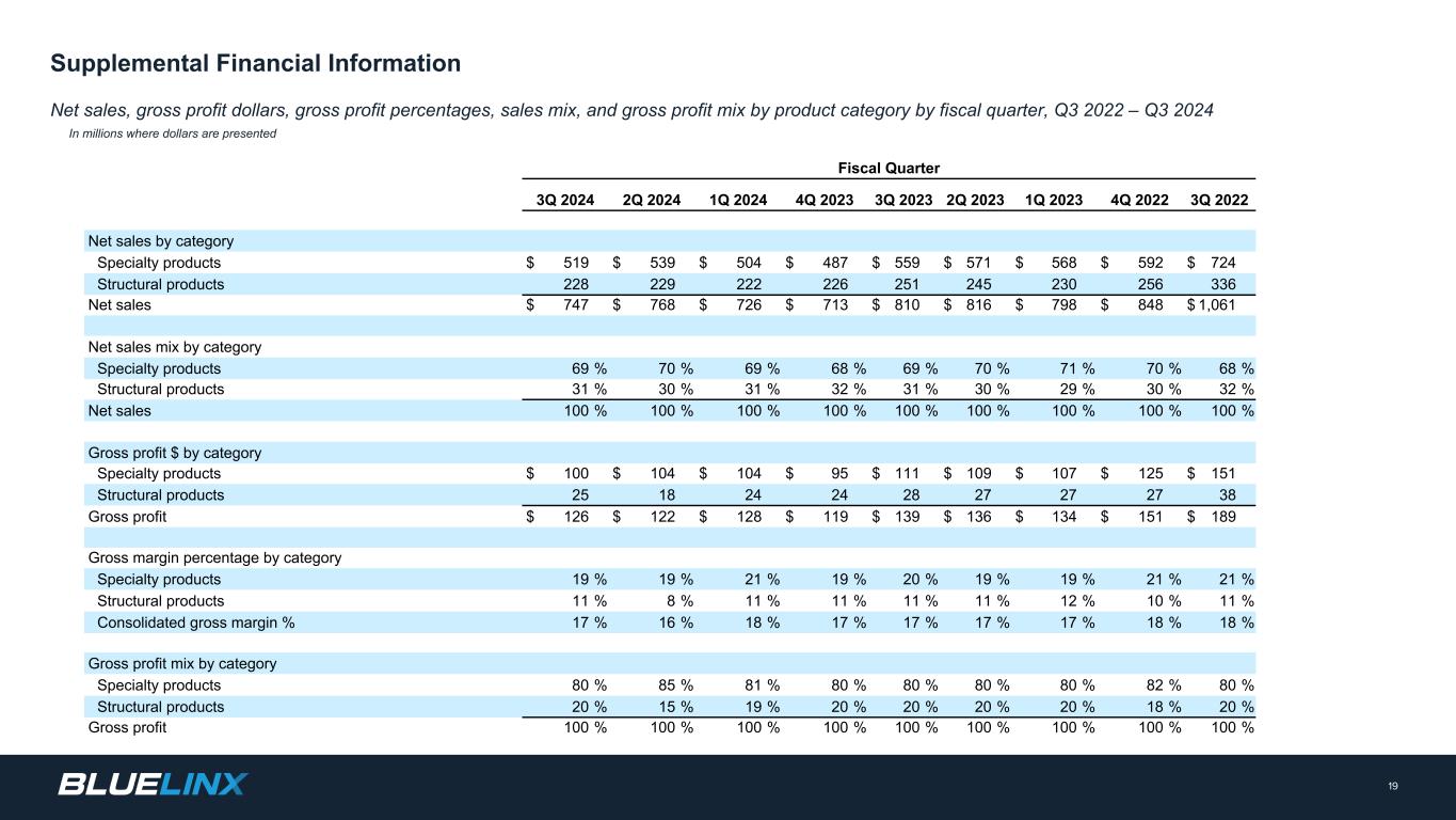 Supplemental Financial Information Net sales, gross profit dollars, gross profit percentages, sales mix, and gross profit mix by product category by fiscal quarter, Q3 2022 – Q3 2024 In millions where dollars are presented 19 Supplementary Financial Information Fiscal Quarter 3Q 2024 2Q 2024 1Q 2024 4Q 2023 3Q 2023 2Q 2023 1Q 2023 4Q 2022 3Q 2022 Net sales by category Specialty products $ 519 $ 539 $ 504 $ 487 $ 559 $ 571 $ 568 $ 592 $ 724 Structural products 228 229 222 226 251 245 230 256 336 Net sales $ 747 $ 768 $ 726 $ 713 $ 810 $ 816 $ 798 $ 848 $ 1,061 Net sales mix by category Specialty products 69 % 70 % 69 % 68 % 69 % 70 % 71 % 70 % 68 % Structural products 31 % 30 % 31 % 32 % 31 % 30 % 29 % 30 % 32 % Net sales 100 % 100 % 100 % 100 % 100 % 100 % 100 % 100 % 100 % Gross profit $ by category Specialty products $ 100 $ 104 $ 104 $ 95 $ 111 $ 109 $ 107 $ 125 $ 151 Structural products 25 18 24 24 28 27 27 27 38 Gross profit $ 126 $ 122 $ 128 $ 119 $ 139 $ 136 $ 134 $ 151 $ 189 Gross margin percentage by category Specialty products 19 % 19 % 21 % 19 % 20 % 19 % 19 % 21 % 21 % Structural products 11 % 8 % 11 % 11 % 11 % 11 % 12 % 10 % 11 % Consolidated gross margin % 17 % 16 % 18 % 17 % 17 % 17 % 17 % 18 % 18 % Gross profit mix by category Specialty products 80 % 85 % 81 % 80 % 80 % 80 % 80 % 82 % 80 % Structural products 20 % 15 % 19 % 20 % 20 % 20 % 20 % 18 % 20 % Gross profit 100 % 100 % 100 % 100 % 100 % 100 % 100 % 100 % 100 %
