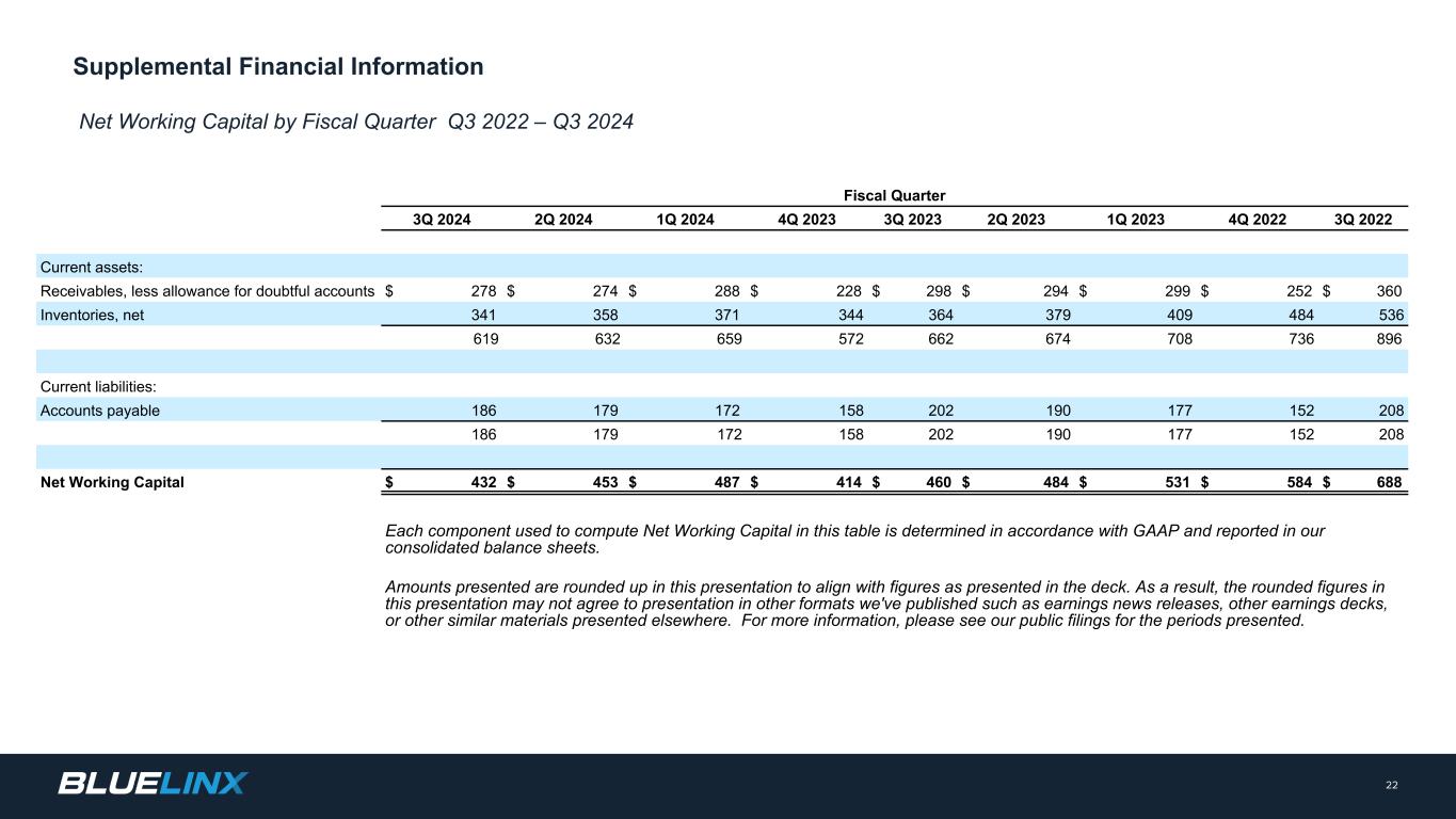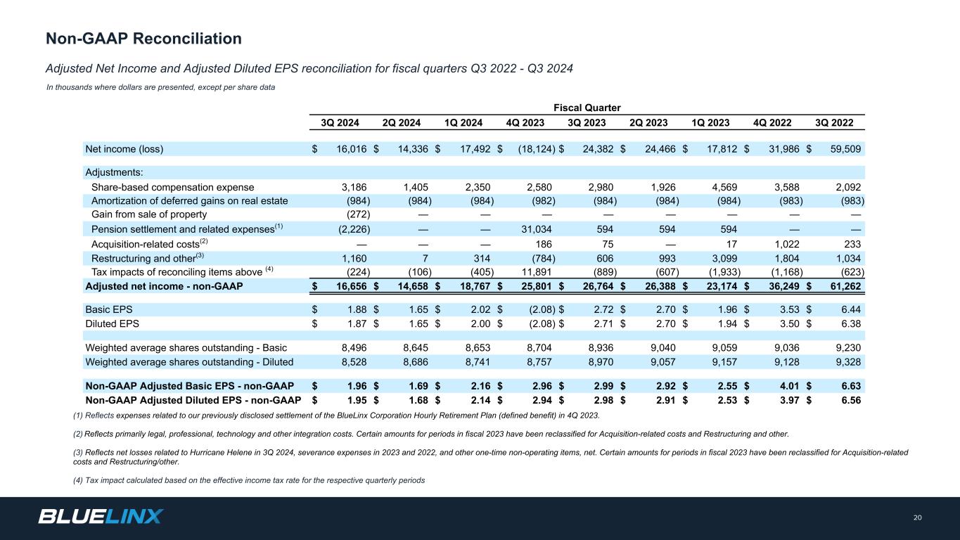 Adjusted Net Income and Adjusted Diluted EPS reconciliation for fiscal quarters Q3 2022 - Q3 2024 In thousands where dollars are presented, except per share data 20 Non-GAAP Reconciliation (1) Reflects expenses related to our previously disclosed settlement of the BlueLinx Corporation Hourly Retirement Plan (defined benefit) in 4Q 2023. (2) Reflects primarily legal, professional, technology and other integration costs. Certain amounts for periods in fiscal 2023 have been reclassified for Acquisition-related costs and Restructuring and other. (3) Reflects net losses related to Hurricane Helene in 3Q 2024, severance expenses in 2023 and 2022, and other one-time non-operating items, net. Certain amounts for periods in fiscal 2023 have been reclassified for Acquisition-related costs and Restructuring/other. (4) Tax impact calculated based on the effective income tax rate for the respective quarterly periods Fiscal Quarter 3Q 2024 2Q 2024 1Q 2024 4Q 2023 3Q 2023 2Q 2023 1Q 2023 4Q 2022 3Q 2022 Net income (loss) $ 16,016 $ 14,336 $ 17,492 $ (18,124) $ 24,382 $ 24,466 $ 17,812 $ 31,986 $ 59,509 Adjustments: Share-based compensation expense 3,186 1,405 2,350 2,580 2,980 1,926 4,569 3,588 2,092 Amortization of deferred gains on real estate (984) (984) (984) (982) (984) (984) (984) (983) (983) Gain from sale of property (272) — — — — — — — — Pension settlement and related expenses(1) (2,226) — — 31,034 594 594 594 — — Acquisition-related costs(2) — — — 186 75 — 17 1,022 233 Restructuring and other(3) 1,160 7 314 (784) 606 993 3,099 1,804 1,034 Tax impacts of reconciling items above (4) (224) (106) (405) 11,891 (889) (607) (1,933) (1,168) (623) Adjusted net income - non-GAAP $ 16,656 $ 14,658 $ 18,767 $ 25,801 $ 26,764 $ 26,388 $ 23,174 $ 36,249 $ 61,262 Basic EPS $ 1.88 $ 1.65 $ 2.02 $ (2.08) $ 2.72 $ 2.70 $ 1.96 $ 3.53 $ 6.44 Diluted EPS $ 1.87 $ 1.65 $ 2.00 $ (2.08) $ 2.71 $ 2.70 $ 1.94 $ 3.50 $ 6.38 Weighted average shares outstanding - Basic 8,496 8,645 8,653 8,704 8,936 9,040 9,059 9,036 9,230 Weighted average shares outstanding - Diluted 8,528 8,686 8,741 8,757 8,970 9,057 9,157 9,128 9,328 Non-GAAP Adjusted Basic EPS - non-GAAP $ 1.96 $ 1.69 $ 2.16 $ 2.96 $ 2.99 $ 2.92 $ 2.55 $ 4.01 $ 6.63 Non-GAAP Adjusted Diluted EPS - non-GAAP $ 1.95 $ 1.68 $ 2.14 $ 2.94 $ 2.98 $ 2.91 $ 2.53 $ 3.97 $ 6.56