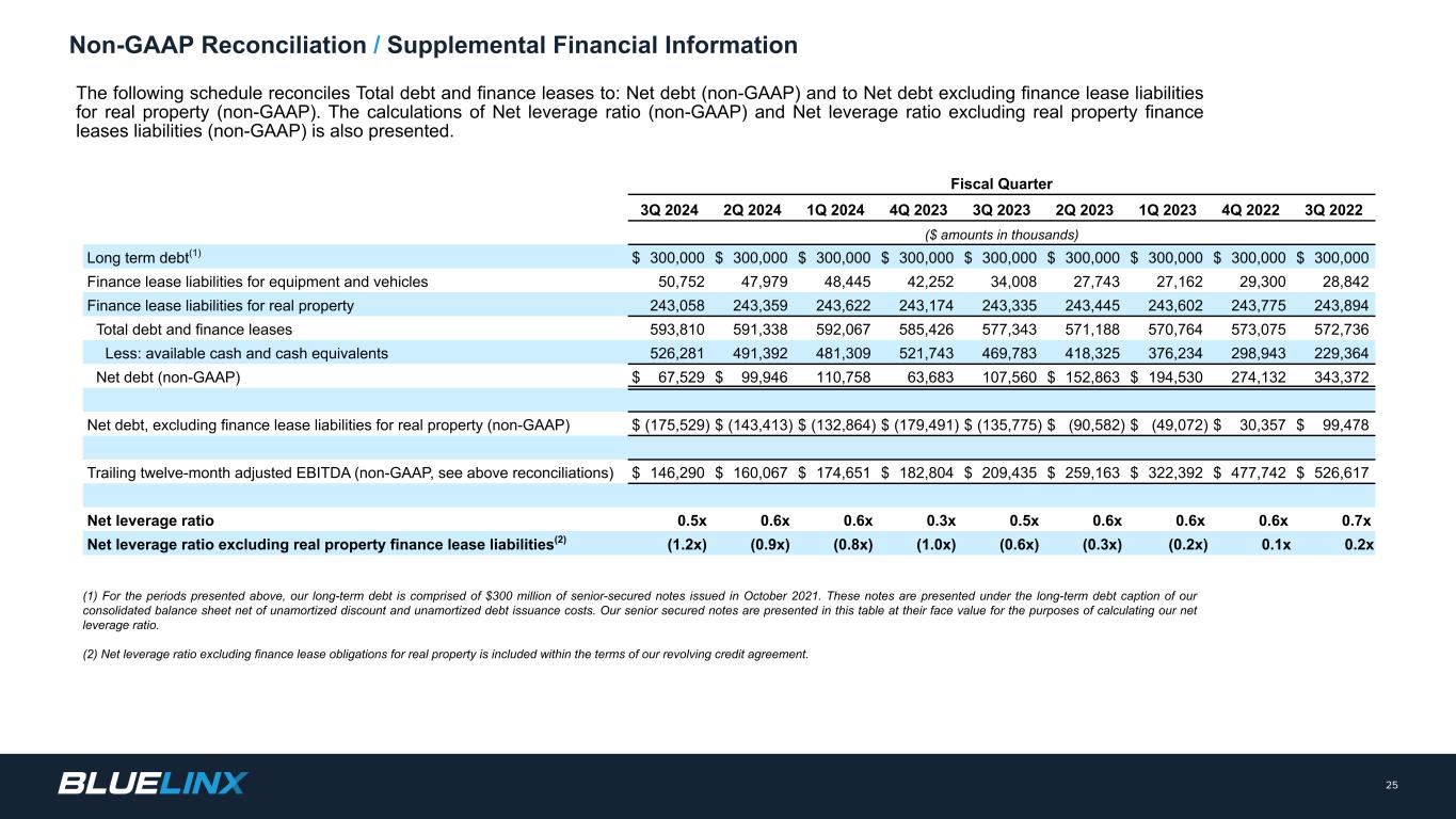 Twelve-Month Trailing Adjusted EBITDA reconciliation by Fiscal Quarter, Q3 2022 – Q3 2024 In millions $ 24 Non-GAAP Reconciliation (1) Reflects expenses related to our previously disclosed settlement of the BlueLinx Corporation Hourly Retirement Plan in 4Q 2023. (2) Reflects primarily legal, professional, technology and other integration costs. Certain amounts for periods in fiscal 2023 have been reclassified for Acquisition-related costs and Restructuring and other. (3) Reflects net losses related to Hurricane Helene in 3Q 2024, severance expenses in 2023 and 2022, and other one-time non-operating items, net. Certain amounts for periods in fiscal 2023 have been reclassified for Acquisition-related costs and Restructuring and other. Note: Figures are rounded in this presentation to align with figures as presented in the deck. As a result, the rounded figures in this presentation may not agree to presentation in other formats we have published such as earnings releases, other earnings decks, or other similar materials presented elsewhere. Twelve-Month Trailing as of the End of Fiscal Quarter 3Q 2024 2Q 2024 1Q 2024 4Q 2023 3Q 2023 2Q 2023 1Q 2023 4Q 2022 3Q 2022 Net income $ 30 $ 38 $ 48 $ 49 $ 99 $ 134 $ 181 $ 296 $ 338 Adjustments: Depreciation and amortization 37 36 34 32 31 30 29 28 27 Interest expense, net 18 19 21 24 29 34 39 42 43 Term loan debt issuance costs — — — — — — — — 2 Provision for (benefit from) income taxes 26 29 32 33 32 44 58 99 115 Share-based compensation expense 10 9 10 12 13 12 12 10 8 Amortization of deferred gain on real estate (4) (4) (4) (4) (4) (4) (4) (4) (4) Gain from sales of property — — — — — — — — (7) Pension settlement and related expenses(1) 29 32 32 33 2 1 1 — — Acquisition-related costs(2) — — — — 1 1 1 1 — Restructuring and other (3) 1 — 1 4 6 7 7 6 6 Adjusted EBITDA - non-GAAP $ 146 $ 160 $ 174 $ 183 $ 209 $ 259 $ 324 $ 478 $ 528