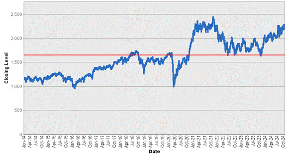 * The red line indicates the hypothetical trigger level of 1,655.996, assuming the closing level on October 25, 2024 were the initial index level.