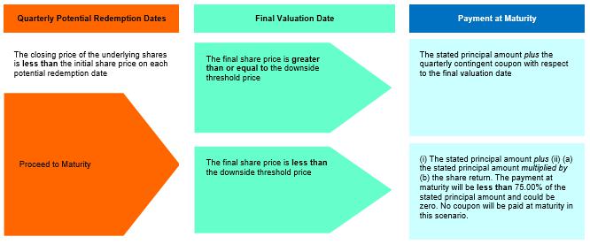 If the closing price of the underlying shares is greater than or equal to the initial share price on any potential redemption date (beginning approximately three months after the issue date), the securities will be automatically redeemed for an early redemption payment equal to the stated principal amount plus the quarterly contingent coupon payment with respect to the related potential redemption date. If the securities have not previously been automatically redeemed and the final share price is greater than or equal to the downside threshold price, the payment at maturity will also be the sum of the stated principal amount and the quarterly contingent coupon payment with respect to the final valuation date. However, if the securities have not previously been automatically redeemed and the final share price is less than the downside threshold price, investors will be exposed to the decline in the closing price of the underlying shares, as compared to the initial share price, on a 1-to-1 basis. Under these circumstances, the payment at maturity will be (i) the stated principal amount plus (ii) (a) the stated principal amount times (b) the share return, which means that the payment at maturity will be less than 75.00% of the stated principal amount of the securities and could be zero. Investors in the securities must be willing to accept the risk of losing their entire principal and also the risk of receiving few or no quarterly contingent coupon payments over the term of the securities. In addition, investors will not participate in any appreciation of the underlying shares.