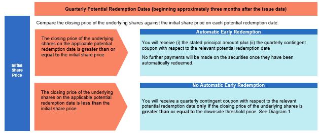 The following diagrams illustrate potential payments on the securities. The first diagram illustrates how to determine whether a contingent coupon payment will be paid with respect to a quarterly valuation date. The second diagram illustrates how to determine whether the securities will be automatically redeemed following a potential redemption date. The third diagram illustrates how to determine the payment at maturity if the securities are not automatically redeemed prior to maturity.