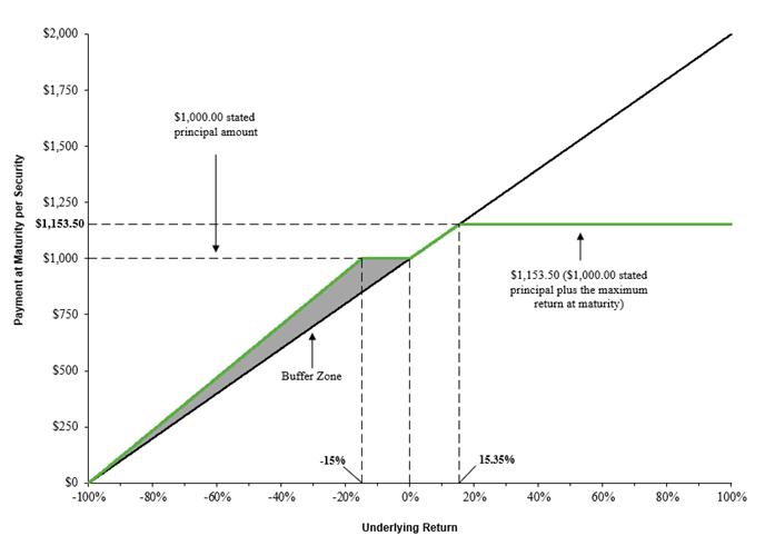 Because the underlying index depreciated from the hypothetical initial index level to the hypothetical final index level, but the hypothetical final index level is greater than the final buffer level, your payment at maturity in this scenario would be equal to the $1,000 stated principal amount per security.