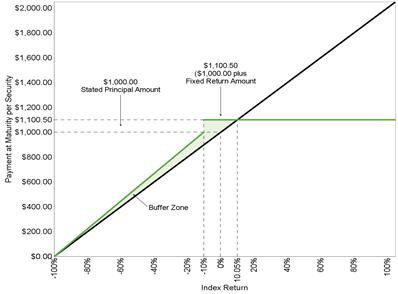 Because the underlying index depreciated from the hypothetical initial index level to the hypothetical final index level, but the hypothetical final index level is greater than the final buffer level, your payment at maturity in this scenario would be equal to the $1,000 stated principal amount per security plus the fixed return amount, or $1,100.50 per security.