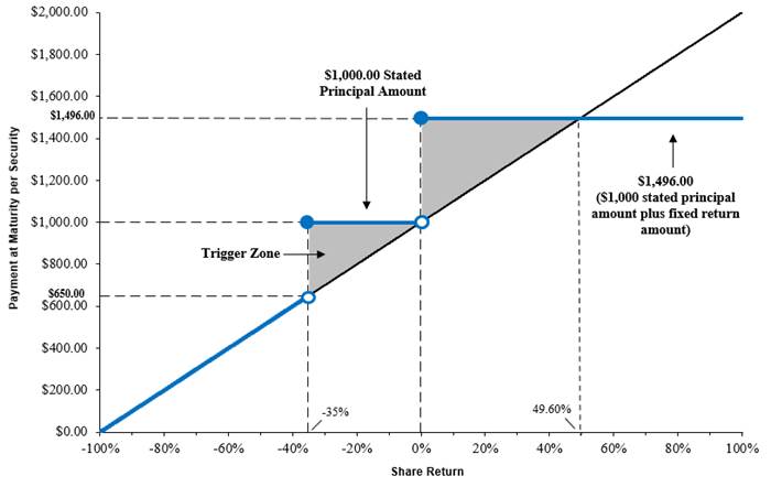 | Fixed return amount: | The fixed return amount will be $496.00 per security (49.60% of the stated principal amount). You will receive the fixed return amount only if the final share price is greater than or equal to the initial share price. | ||