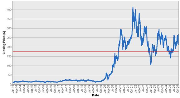 | Common Stock of Tesla, Inc. – Historical Closing Prices* January 2, 2014 to October 25, 2024 |