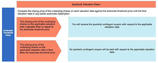 | Contingent coupon: | On each quarterly contingent coupon payment date, unless previously automatically redeemed, the securities will pay a contingent coupon equal to 2.20% of the stated principal amount of the securities (8.80% per annum) if and only if the closing price of the underlying shares on the related valuation date is greater than or equal to the downside threshold price. If the closing price of the underlying shares on any quarterly valuation date is less than the downside threshold price, you will not receive any contingent coupon payment on the related contingent coupon payment date. |