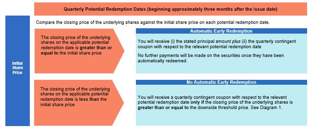 * The early redemption payment includes the unpaid quarterly contingent coupon payment with respect to the potential redemption date on which the closing price of the underlying shares is greater than or equal to the initial share price and the securities are automatically redeemed as a result.