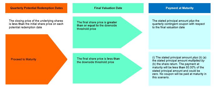 If the closing price of the underlying shares is greater than or equal to the initial share price on any potential redemption date (beginning approximately three months after the issue date), the securities will be automatically redeemed for an early redemption payment equal to the stated principal amount plus the quarterly contingent coupon payment with respect to the related potential redemption date. If the securities have not previously been automatically redeemed and the final share price is greater than or equal to the downside threshold price, the payment at maturity will also be the sum of the stated principal amount and the quarterly contingent coupon payment with respect to the final valuation date. However, if the securities have not previously been automatically redeemed and the final share price is less than the downside threshold price, investors will be exposed to the decline in the closing price of the underlying shares, as compared to the initial share price, on a 1-to-1 basis. Under these circumstances, the payment at maturity will be (i) the stated principal amount plus (ii) (a) the stated principal amount times (b) the share return, which means that the payment at maturity will be less than 80.00% of the stated principal amount of the securities and could be zero. Investors in the securities must be willing to accept the risk of losing their entire principal and also the risk of receiving few or no quarterly contingent coupon payments over the term of the securities. In addition, investors will not participate in any appreciation of the underlying shares.