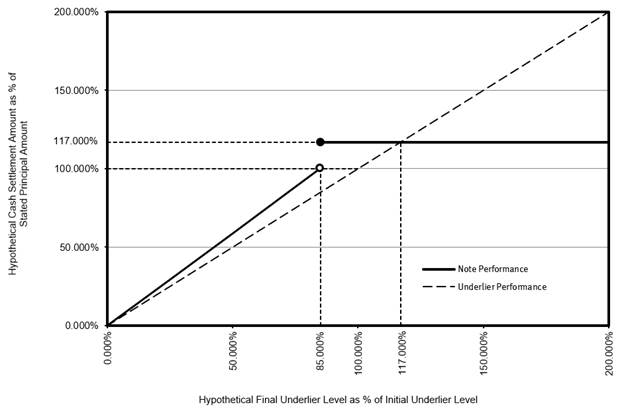 The following chart also shows a graphical illustration of the hypothetical cash settlement amounts that we would pay on your notes on the maturity date, if the final underlier level (expressed as a percentage of the initial underlier level) were any of the hypothetical levels shown on the horizontal axis. The chart shows that any hypothetical final underlier level (expressed as a percentage of the initial underlier level) of less than 85.000% (the section left of the 85.000% marker on the horizontal axis) would result in a hypothetical cash settlement amount of less than 100.000% of the stated principal amount of your notes (the section below the 100.000% marker on the vertical axis) and, accordingly, in a loss of principal to the holder of the notes. The chart also shows that any hypothetical final underlier level (expressed as a percentage of the initial underlier level) of greater than or equal to 85.000% (the section right of the 85.000% marker on the horizontal axis) would result in a capped return on your investment.