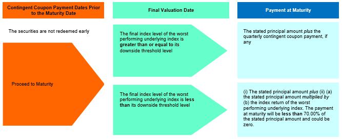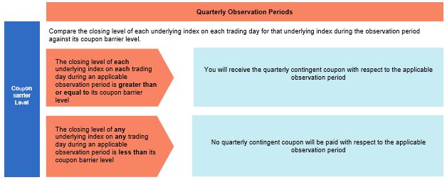 The following diagrams illustrate potential payments on the securities. The first diagram illustrates how to determine whether a contingent coupon payment will be paid with respect to a quarterly observation period. The second diagram illustrates how to determine the payment at maturity if the securities are not redeemed by us prior to maturity.