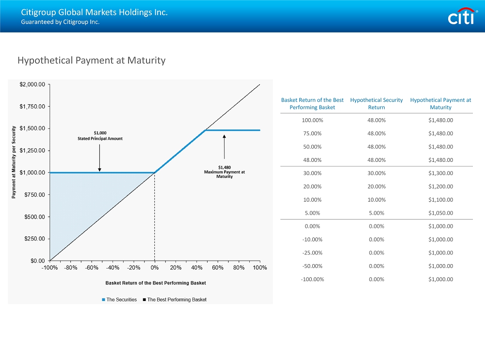 Citigroup Global Markets Holdings Inc. Guaranteed by Citigroup Inc. Hypothetical Payment at Maturity Hypothetical Payment at Maturity Hypothetical Security Return Basket Return of the Best Performing Basket $1,480.00 48.00% 100.00% $1,480.00 48.00% 75.00% $1,480.00 48.00% 50.00% $1,480.00 48.00% 48.00% $1,300.00 30.00% 30.00% $1,200.00 20.00% 20.00% $1,100.00 10.00% 10.00% $1,050.00 5.00% 5.00% $1,000.00 0.00% 0.00% $1,000.00 0.00% - 10.00% $1,000.00 0.00% - 25.00% $1,000.00 0.00% - 50.00% $1,000.00 0.00% - 100.00%