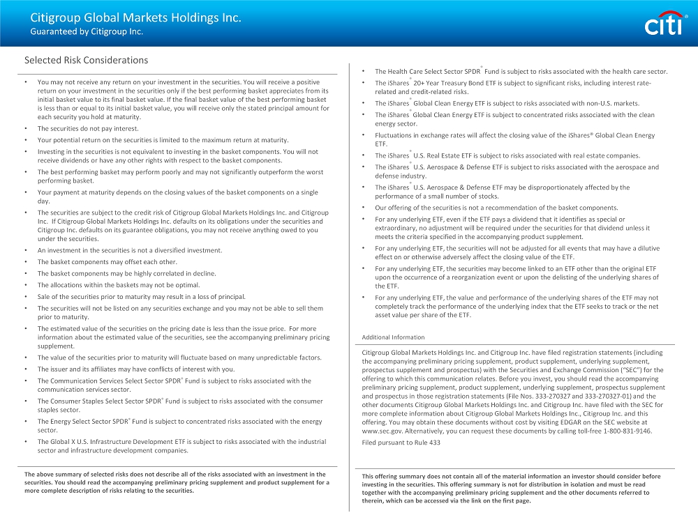 Selected Risk Considerations • You may not receive any return on your investment in the securities. You will receive a positive return on your investment in the securities only if the best performing basket appreciates from its initial basket value to its final basket value. If the final basket value of the best performing basket is less than or equal to its initial basket value, you will receive only the stated principal amount for each security you hold at maturity. • The securities do not pay interest. • Your potential return on the securities is limited to the maximum return at maturity. • Investing in the securities is not equivalent to investing in the basket components. You will not receive dividends or have any other rights with respect to the basket components. • The best performing basket may perform poorly and may not significantly outperform the worst performing basket. • Your payment at maturity depends on the closing values of the basket components on a single day. • The securities are subject to the credit risk of Citigroup Global Markets Holdings Inc. and Citigroup Inc. If Citigroup Global Markets Holdings Inc. defaults on its obligations under the securities and Citigroup Inc. defaults on its guarantee obligations, you may not receive anything owed to you under the securities. • An investment in the securities is not a diversified investment. • The basket components may offset each other. • The basket components may be highly correlated in decline. • The allocations within the baskets may not be optimal. • Sale of the securities prior to maturity may result in a loss of principal. • The securities will not be listed on any securities exchange and you may not be able to sell them prior to maturity. • The estimated value of the securities on the pricing date is less than the issue price. For more information about the estimated value of the securities, see the accompanying preliminary pricing supplement. • The value of the securities prior to maturity will fluctuate based on many unpredictable factors. • The issuer and its affiliates may have conflicts of interest with you. • The Communication Services Select Sector SPDR ® Fund is subject to risks associated with the communication services sector. • The Consumer Staples Select Sector SPDR ® Fund is subject to risks associated with the consumer staples sector. • The Energy Select Sector SPDR ® Fund is subject to concentrated risks associated with the energy sector. • The Global X U.S. Infrastructure Development ETF is subject to risks associated with the industrial sector and infrastructure development companies. The above summary of selected risks does not describe all of the risks associated with an investment in the securities. You should read the accompanying preliminary pricing supplement and product supplement for a more complete description of risks relating to the securities. • The Health Care Select Sector SPDR ® Fund is subject to risks associated with the health care sector. • The iShares ® 20+ Year Treasury Bond ETF is subject to significant risks, including interest rate - related and credit - related risks. • The iShares ® Global Clean Energy ETF is subject to risks associated with non - U.S. markets. • The iShares ® Global Clean Energy ETF is subject to concentrated risks associated with the clean energy sector. • Fluctuations in exchange rates will affect the closing value of the iShares® Global Clean Energy ETF. • The iShares ® U.S. Real Estate ETF is subject to risks associated with real estate companies. • The iShares ® U.S. Aerospace & Defense ETF is subject to risks associated with the aerospace and defense industry. • The iShares ® U.S. Aerospace & Defense ETF may be disproportionately affected by the performance of a small number of stocks. • Our offering of the securities is not a recommendation of the basket components. • For any underlying ETF, even if the ETF pays a dividend that it identifies as special or extraordinary, no adjustment will be required under the securities for that dividend unless it meets the criteria specified in the accompanying product supplement. • For any underlying ETF, the securities will not be adjusted for all events that may have a dilutive effect on or otherwise adversely affect the closing value of the ETF. • For any underlying ETF, the securities may become linked to an ETF other than the original ETF upon the occurrence of a reorganization event or upon the delisting of the underlying shares of the ETF. • For any underlying ETF, the value and performance of the underlying shares of the ETF may not completely track the performance of the underlying index that the ETF seeks to track or the net asset value per share of the ETF. Additional Information Citigroup Global Markets Holdings Inc. and Citigroup Inc. have filed registration statements (including the accompanying preliminary pricing supplement, product supplement, underlying supplement, prospectus supplement and prospectus) with the Securities and Exchange Commission (“SEC”) for the offering to which this communication relates. Before you invest, you should read the accompanying preliminary pricing supplement, product supplement, underlying supplement, prospectus supplement and prospectus in those registration statements (File Nos. 333 - 270327 and 333 - 270327 - 01) and the other documents Citigroup Global Markets Holdings Inc. and Citigroup Inc. have filed with the SEC for more complete information about Citigroup Global Markets Holdings Inc., Citigroup Inc. and this offering. You may obtain these documents without cost by visiting EDGAR on the SEC website at www.sec.gov. Alternatively, you can request these documents by calling toll - free 1 - 800 - 831 - 9146. Filed pursuant to Rule 433 This offering summary does not contain all of the material information an investor should consider before investing in the securities. This offer