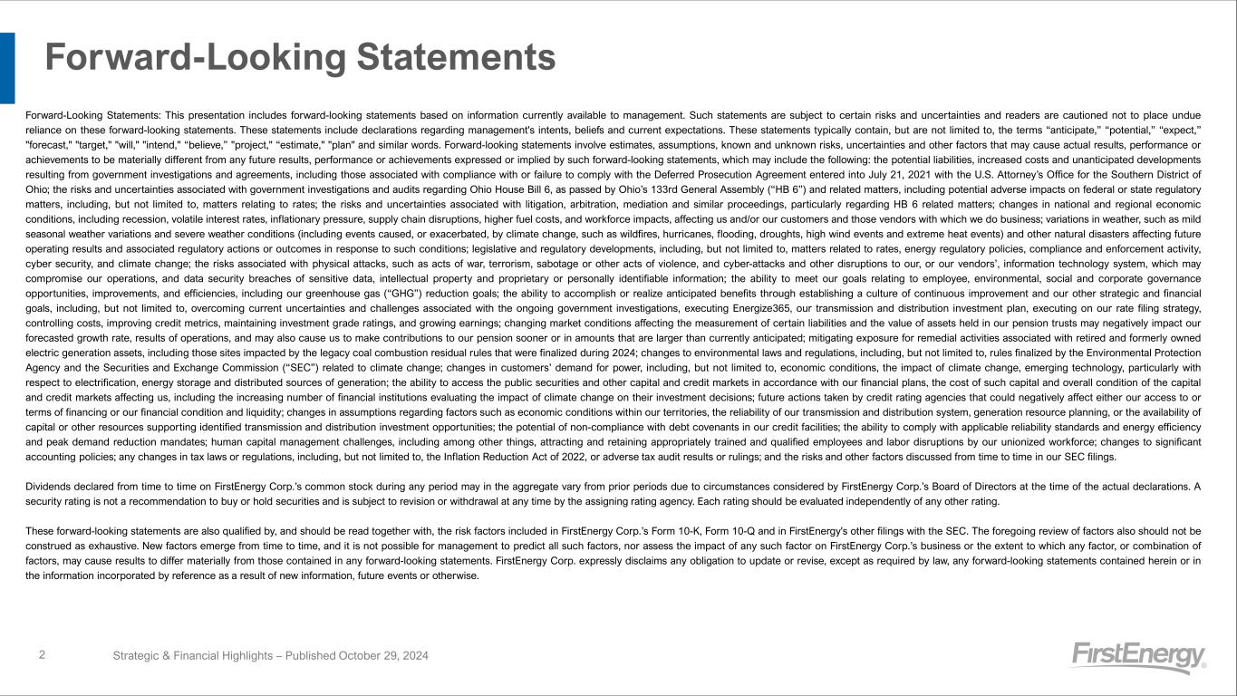 Forward-Looking Statements Forward-Looking Statements: This presentation includes forward-looking statements based on information currently available to management. Such statements are subject to certain risks and uncertainties and readers are cautioned not to place undue reliance on these forward-looking statements. These statements include declarations regarding management's intents, beliefs and current expectations. These statements typically contain, but are not limited to, the terms “anticipate,” “potential,” “expect,” "forecast," "target," "will," "intend," “believe,” "project," “estimate," "plan" and similar words. Forward-looking statements involve estimates, assumptions, known and unknown risks, uncertainties and other factors that may cause actual results, performance or achievements to be materially different from any future results, performance or achievements expressed or implied by such forward-looking statements, which may include the following: the potential liabilities, increased costs and unanticipated developments resulting from government investigations and agreements, including those associated with compliance with or failure to comply with the Deferred Prosecution Agreement entered into July 21, 2021 with the U.S. Attorney’s Office for the Southern District of Ohio; the risks and uncertainties associated with government investigations and audits regarding Ohio House Bill 6, as passed by Ohio’s 133rd General Assembly (“HB 6”) and related matters, including potential adverse impacts on federal or state regulatory matters, including, but not limited to, matters relating to rates; the risks and uncertainties associated with litigation, arbitration, mediation and similar proceedings, particularly regarding HB 6 related matters; changes in national and regional economic conditions, including recession, volatile interest rates, inflationary pressure, supply chain disruptions, higher fuel costs, and workforce impacts, affecting us and/or our customers and those vendors with which we do business; variations in weather, such as mild seasonal weather variations and severe weather conditions (including events caused, or exacerbated, by climate change, such as wildfires, hurricanes, flooding, droughts, high wind events and extreme heat events) and other natural disasters affecting future operating results and associated regulatory actions or outcomes in response to such conditions; legislative and regulatory developments, including, but not limited to, matters related to rates, energy regulatory policies, compliance and enforcement activity, cyber security, and climate change; the risks associated with physical attacks, such as acts of war, terrorism, sabotage or other acts of violence, and cyber-attacks and other disruptions to our, or our vendors’, information technology system, which may compromise our operations, and data security breaches of sensitive data, intellectual property and proprietary or personally identifiable information; the ability to meet our goals relating to employee, environmental, social and corporate governance opportunities, improvements, and efficiencies, including our greenhouse gas (“GHG”) reduction goals; the ability to accomplish or realize anticipated benefits through establishing a culture of continuous improvement and our other strategic and financial goals, including, but not limited to, overcoming current uncertainties and challenges associated with the ongoing government investigations, executing Energize365, our transmission and distribution investment plan, executing on our rate filing strategy, controlling costs, improving credit metrics, maintaining investment grade ratings, and growing earnings; changing market conditions affecting the measurement of certain liabilities and the value of assets held in our pension trusts may negatively impact our forecasted growth rate, results of operations, and may also cause us to make contributions to our pension sooner or in amounts that are larger than currently anticipated; mitigating exposure for remedial activities associated with retired and formerly owned electric generation assets, including those sites impacted by the legacy coal combustion residual rules that were finalized during 2024; changes to environmental laws and regulations, including, but not limited to, rules finalized by the Environmental Protection Agency and the Securities and Exchange Commission (“SEC”) related to climate change; changes in customers’ demand for power, including, but not limited to, economic conditions, the impact of climate change, emerging technology, particularly with respect to electrification, energy storage and distributed sources of generation; the ability to access the public securities and other capital and credit markets in accordance with our financial plans, the cost of such capital and overall condition of the capital and credit markets affecting us, including the increasing number of financial institutions evaluating the impact of climate change on their investment decisions; future actions taken by credit rating agencies that could negatively affect either our access to or terms of financing or our financial condition and liquidity; changes in assumptions regarding factors such as economic conditions within our territories, the reliability of our transmission and distribution system, generation resource planning, or the availability of capital or other resources supporting identified transmission and distribution investment opportunities; the potential of non-compliance with debt covenants in our credit facilities; the ability to comply with applicable reliability standards and energy efficiency and peak demand reduction mandates; human capital management challenges, including among other things, attracting and retaining appropriately trained and qualified employees and labor disruptions by our unionized workforce; changes to significant accounting policies; 