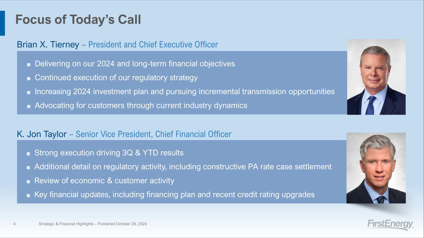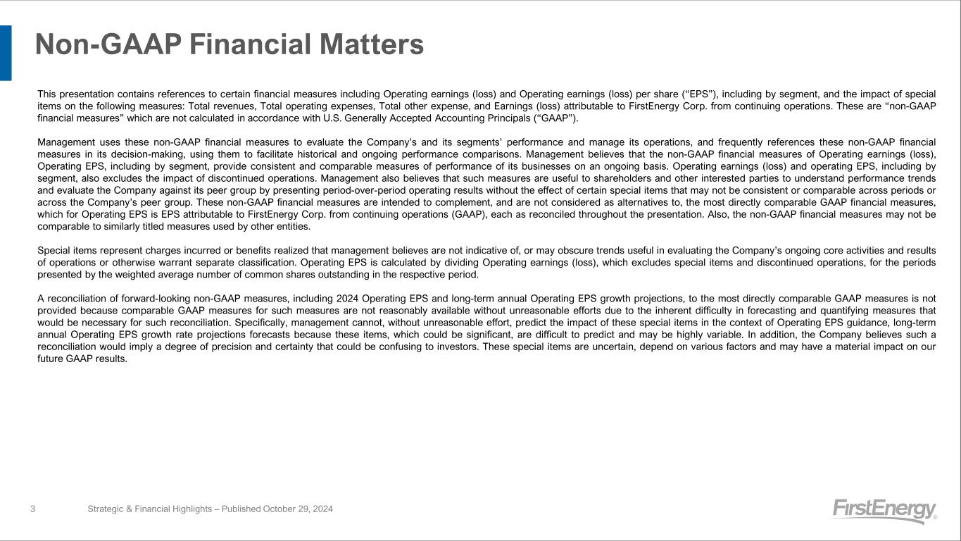 Non-GAAP Financial Matters Strategic & Financial Highlights – Published October 29, 2024 This presentation contains references to certain financial measures including Operating earnings (loss) and Operating earnings (loss) per share (“EPS”), including by segment, and the impact of special items on the following measures: Total revenues, Total operating expenses, Total other expense, and Earnings (loss) attributable to FirstEnergy Corp. from continuing operations. These are “non-GAAP financial measures” which are not calculated in accordance with U.S. Generally Accepted Accounting Principals (“GAAP”). Management uses these non-GAAP financial measures to evaluate the Company’s and its segments’ performance and manage its operations, and frequently references these non-GAAP financial measures in its decision-making, using them to facilitate historical and ongoing performance comparisons. Management believes that the non-GAAP financial measures of Operating earnings (loss), Operating EPS, including by segment, provide consistent and comparable measures of performance of its businesses on an ongoing basis. Operating earnings (loss) and operating EPS, including by segment, also excludes the impact of discontinued operations. Management also believes that such measures are useful to shareholders and other interested parties to understand performance trends and evaluate the Company against its peer group by presenting period-over-period operating results without the effect of certain special items that may not be consistent or comparable across periods or across the Company’s peer group. These non-GAAP financial measures are intended to complement, and are not considered as alternatives to, the most directly comparable GAAP financial measures, which for Operating EPS is EPS attributable to FirstEnergy Corp. from continuing operations (GAAP), each as reconciled throughout the presentation. Also, the non-GAAP financial measures may not be comparable to similarly titled measures used by other entities. Special items represent charges incurred or benefits realized that management believes are not indicative of, or may obscure trends useful in evaluating the Company’s ongoing core activities and results of operations or otherwise warrant separate classification. Operating EPS is calculated by dividing Operating earnings (loss), which excludes special items and discontinued operations, for the periods presented by the weighted average number of common shares outstanding in the respective period. A reconciliation of forward-looking non-GAAP measures, including 2024 Operating EPS and long-term annual Operating EPS growth projections, to the most directly comparable GAAP measures is not provided because comparable GAAP measures for such measures are not reasonably available without unreasonable efforts due to the inherent difficulty in forecasting and quantifying measures that would be necessary for such reconciliation. Specifically, management cannot, without unreasonable effort, predict the impact of these special items in the context of Operating EPS guidance, long-term annual Operating EPS growth rate projections forecasts because these items, which could be significant, are difficult to predict and may be highly variable. In addition, the Company believes such a reconciliation would imply a degree of precision and certainty that could be confusing to investors. These special items are uncertain, depend on various factors and may have a material impact on our future GAAP results. 3