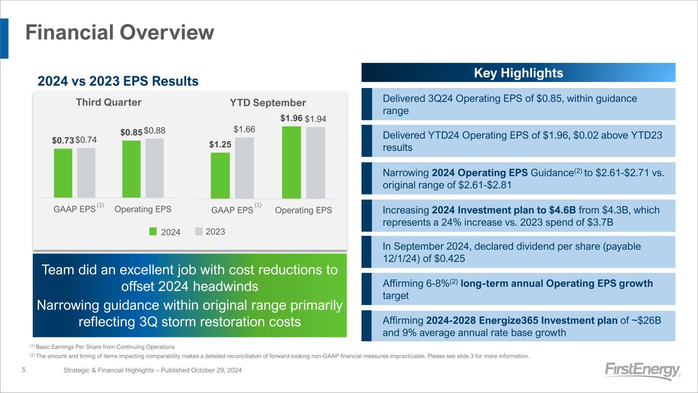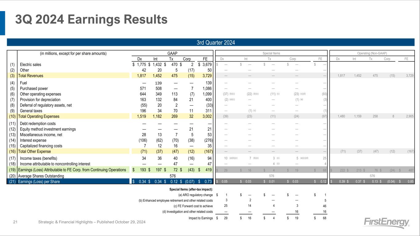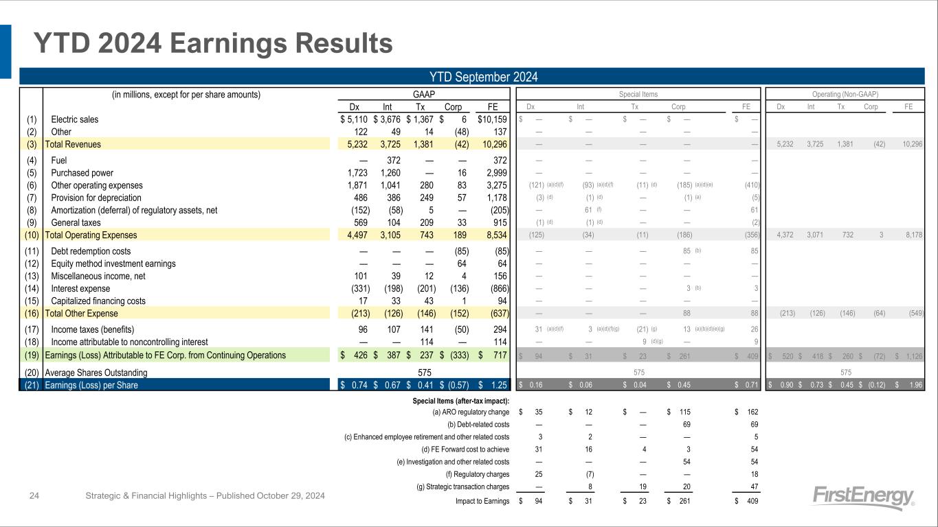 For the first nine months of 2024, FirstEnergy reported GAAP earnings from continuing operations of $717 million, or $1.25 per basic share ($1.24 diluted), on revenue of $10.3 billion. This compares to GAAP earnings from continuing operations of $948 million, or $1.66 per basic share ($1.65 diluted), on revenue of $9.7 billion in the first nine months of 2023. GAAP results for both periods reflect the impact of special items listed below.
