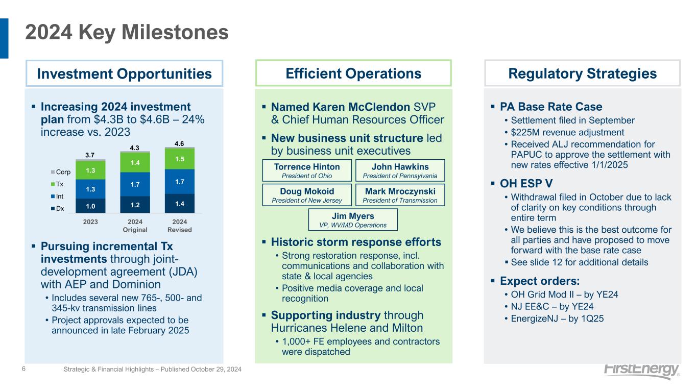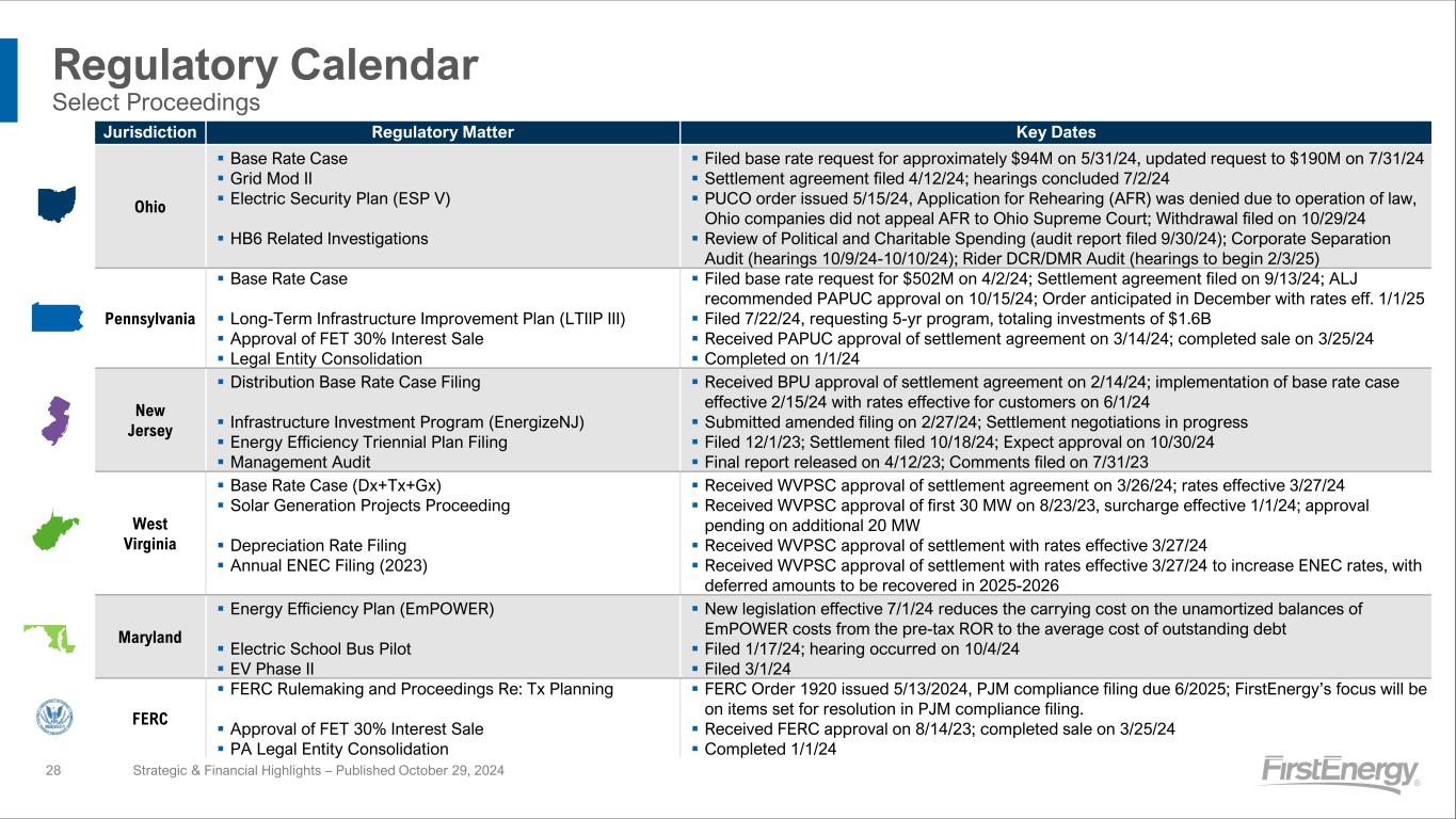 Jurisdiction Regulatory Matter Key Dates Ohio ▪ Base Rate Case ▪ Grid Mod II ▪ Electric Security Plan (ESP V) ▪ HB6 Related Investigations ▪ Filed base rate request for approximately $94M on 5/31/24, updated request to $190M on 7/31/24 ▪ Settlement agreement filed 4/12/24; hearings concluded 7/2/24 ▪ PUCO order issued 5/15/24, Application for Rehearing (AFR) was denied due to operation of law, Ohio companies did not appeal AFR to Ohio Supreme Court; Withdrawal filed on 10/29/24 ▪ Review of Political and Charitable Spending (audit report filed 9/30/24); Corporate Separation Audit (hearings 10/9/24-10/10/24); Rider DCR/DMR Audit (hearings to begin 2/3/25) Pennsylvania ▪ Base Rate Case ▪ Long-Term Infrastructure Improvement Plan (LTIIP III) ▪ Approval of FET 30% Interest Sale ▪ Legal Entity Consolidation ▪ Filed base rate request for $502M on 4/2/24; Settlement agreement filed on 9/13/24; ALJ recommended PAPUC approval on 10/15/24; Order anticipated in December with rates eff. 1/1/25 ▪ Filed 7/22/24, requesting 5-yr program, totaling investments of $1.6B ▪ Received PAPUC approval of settlement agreement on 3/14/24; completed sale on 3/25/24 ▪ Completed on 1/1/24 New Jersey ▪ Distribution Base Rate Case Filing ▪ Infrastructure Investment Program (EnergizeNJ) ▪ Energy Efficiency Triennial Plan Filing ▪ Management Audit ▪ Received BPU approval of settlement agreement on 2/14/24; implementation of base rate case effective 2/15/24 with rates effective for customers on 6/1/24 ▪ Submitted amended filing on 2/27/24; Settlement negotiations in progress ▪ Filed 12/1/23; Settlement filed 10/18/24; Expect approval on 10/30/24 ▪ Final report released on 4/12/23; Comments filed on 7/31/23 West Virginia ▪ Base Rate Case (Dx+Tx+Gx) ▪ Solar Generation Projects Proceeding ▪ Depreciation Rate Filing ▪ Annual ENEC Filing (2023) ▪ Received WVPSC approval of settlement agreement on 3/26/24; rates effective 3/27/24 ▪ Received WVPSC approval of first 30 MW on 8/23/23, surcharge effective 1/1/24; approval pending on additional 20 MW ▪ Received WVPSC approval of settlement with rates effective 3/27/24 ▪ Received WVPSC approval of settlement with rates effective 3/27/24 to increase ENEC rates, with deferred amounts to be recovered in 2025-2026 Maryland ▪ Energy Efficiency Plan (EmPOWER) ▪ Electric School Bus Pilot ▪ EV Phase II ▪ New legislation effective 7/1/24 reduces the carrying cost on the unamortized balances of EmPOWER costs from the pre-tax ROR to the average cost of outstanding debt ▪ Filed 1/17/24; hearing occurred on 10/4/24 ▪ Filed 3/1/24 FERC ▪ FERC Rulemaking and Proceedings Re: Tx Planning ▪ Approval of FET 30% Interest Sale ▪ PA Legal Entity Consolidation ▪ FERC Order 1920 issued 5/13/2024, PJM compliance filing due 6/2025; FirstEnergy’s focus will be on items set for resolution in PJM compliance filing. ▪ Received FERC approval on 8/14/23; completed sale on 3/25/24 ▪ Completed 1/1/24 Regulatory Calendar Select Proceedings Strategic & Financial Highlights – Published October 29, 202428