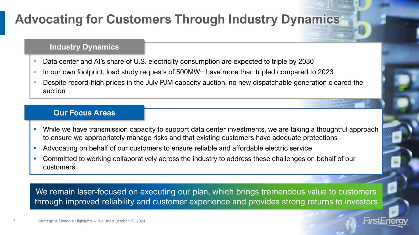 2024 Key Milestones Strategic & Financial Highlights – Published October 29, 2024 ▪ Increasing 2024 investment plan from $4.3B to $4.6B – 24% increase vs. 2023 ▪ Pursuing incremental Tx investments through joint- development agreement (JDA) with AEP and Dominion • Includes several new 765-, 500- and 345-kv transmission lines • Project approvals expected to be announced in late February 2025 ▪ Named Karen McClendon SVP & Chief Human Resources Officer ▪ New business unit structure led by business unit executives ▪ Historic storm response efforts • Strong restoration response, incl. communications and collaboration with state & local agencies • Positive media coverage and local recognition ▪ Supporting industry through Hurricanes Helene and Milton • 1,000+ FE employees and contractors were dispatched ▪ PA Base Rate Case • Settlement filed in September • $225M revenue adjustment • Received ALJ recommendation for PAPUC to approve the settlement with new rates effective 1/1/2025 ▪ OH ESP V • Withdrawal filed in October due to lack of clarity on key conditions through entire term • We believe this is the best outcome for all parties and have proposed to move forward with the base rate case ▪ See slide 12 for additional details ▪ Expect orders: • OH Grid Mod II – by YE24 • NJ EE&C – by YE24 • EnergizeNJ – by 1Q25 Investment Opportunities Efficient Operations Regulatory Strategies Torrence Hinton President of Ohio John Hawkins President of Pennsylvania Doug Mokoid President of New Jersey Mark Mroczynski President of Transmission 4.3 4.6 3.7 1.0 1.2 1.4 1.3 1.7 1.7 1.3 1.4 1.5 2023 2024 Original 2024 Revised Corp Tx Int Dx Jim Myers VP, WV/MD Operations 6