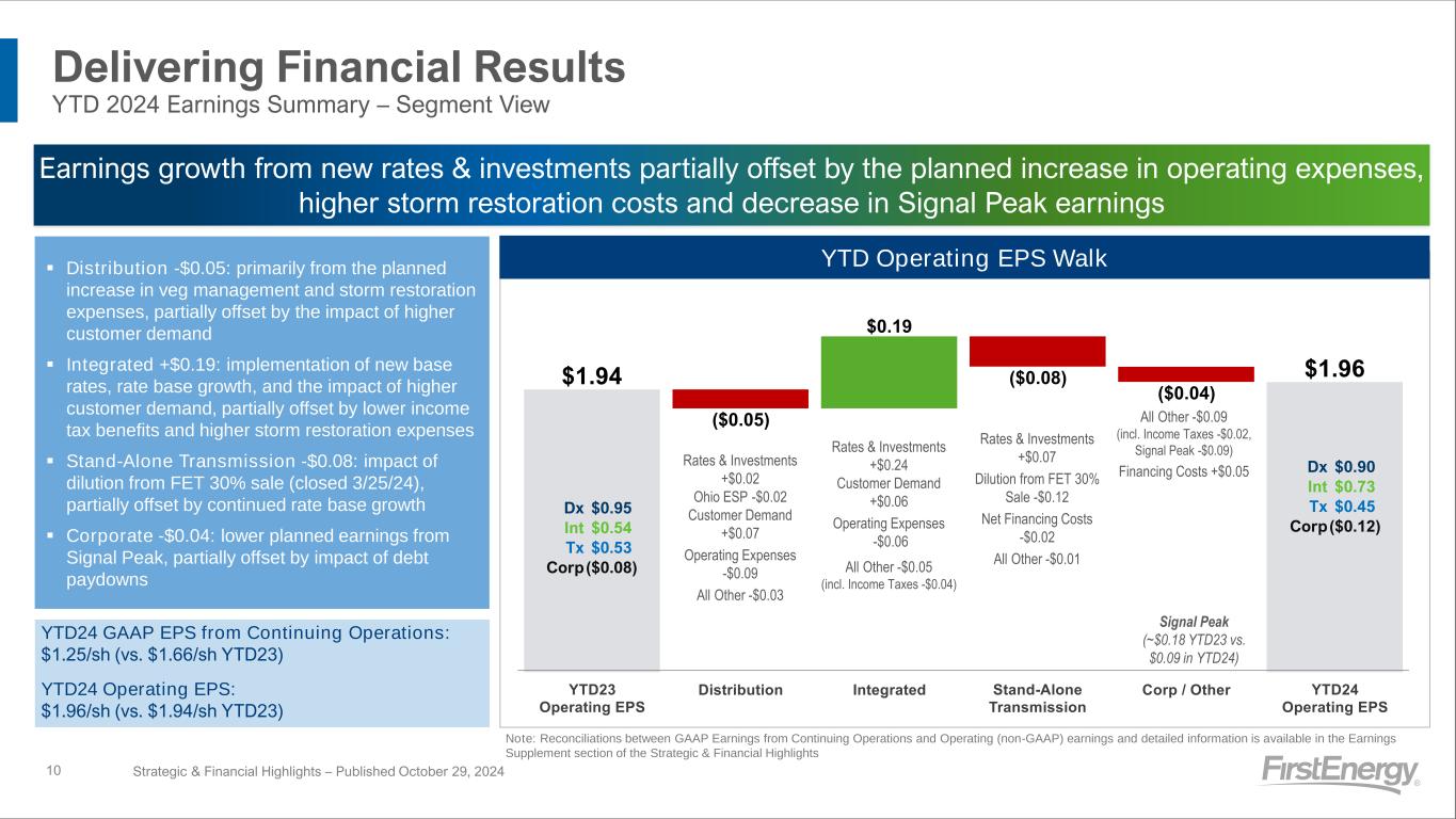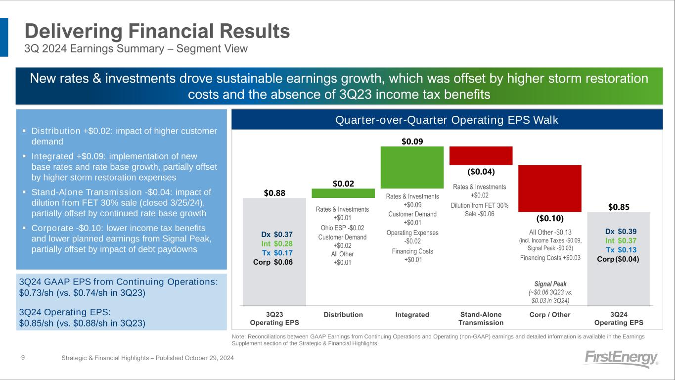 Delivering Financial Results 3Q 2024 Earnings Summary – Segment View Strategic & Financial Highlights – Published October 29, 2024 Note: Reconciliations between GAAP Earnings from Continuing Operations and Operating (non-GAAP) earnings and detailed information is available in the Earnings Supplement section of the Strategic & Financial Highlights Quarter-over-Quarter Operating EPS Walk Dx $0.37 Int $0.28 Tx $0.17 Corp $0.06 Dx $0.39 Int $0.37 Tx $0.13 Corp($0.04) ▪ Distribution +$0.02: impact of higher customer demand ▪ Integrated +$0.09: implementation of new base rates and rate base growth, partially offset by higher storm restoration expenses ▪ Stand-Alone Transmission -$0.04: impact of dilution from FET 30% sale (closed 3/25/24), partially offset by continued rate base growth ▪ Corporate -$0.10: lower income tax benefits and lower planned earnings from Signal Peak, partially offset by impact of debt paydowns 3Q24 GAAP EPS from Continuing Operations: $0.73/sh (vs. $0.74/sh in 3Q23) 3Q24 Operating EPS: $0.85/sh (vs. $0.88/sh in 3Q23) Rates & Investments +$0.01 Ohio ESP -$0.02 Customer Demand +$0.02 All Other +$0.01 Rates & Investments +$0.02 Dilution from FET 30% Sale -$0.06 All Other -$0.13 (incl. Income Taxes -$0.09, Signal Peak -$0.03) Financing Costs +$0.03 Rates & Investments +$0.09 Customer Demand +$0.01 Operating Expenses -$0.02 Financing Costs +$0.01 Signal Peak (~$0.06 3Q23 vs. $0.03 in 3Q24) New rates & investments drove sustainable earnings growth, which was offset by higher storm restoration costs and the absence of 3Q23 income tax benefits 9