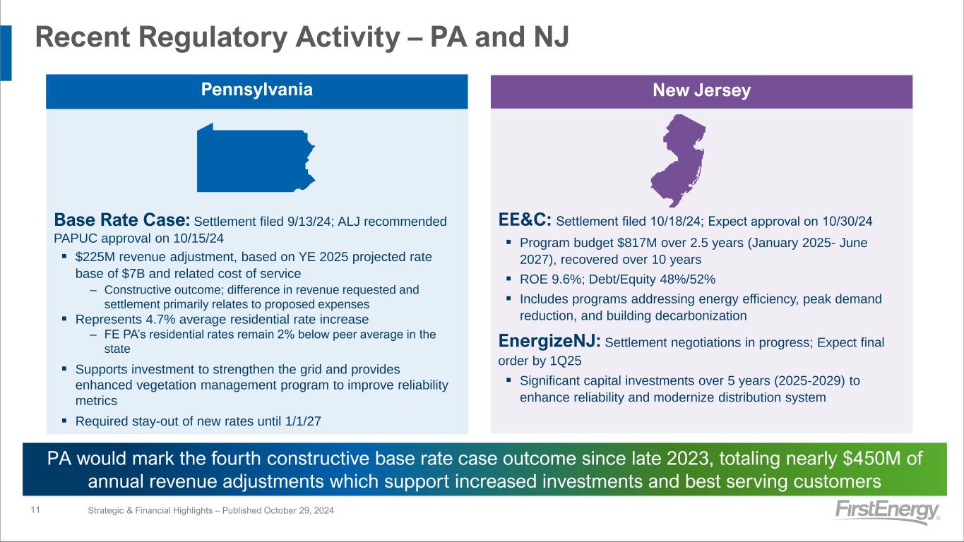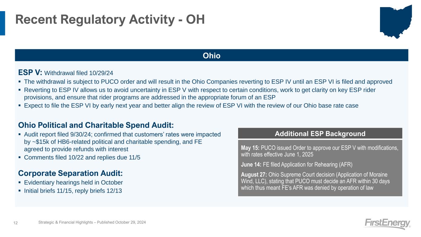 Recent Regulatory Activity - OH Strategic & Financial Highlights – Published October 29, 2024 ESP V: Withdrawal filed 10/29/24 ▪ The withdrawal is subject to PUCO order and will result in the Ohio Companies reverting to ESP IV until an ESP VI is filed and approved ▪ Reverting to ESP IV allows us to avoid uncertainty in ESP V with respect to certain conditions, work to get clarity on key ESP rider provisions, and ensure that rider programs are addressed in the appropriate forum of an ESP ▪ Expect to file the ESP VI by early next year and better align the review of ESP VI with the review of our Ohio base rate case Ohio Additional ESP Background May 15: PUCO issued Order to approve our ESP V with modifications, with rates effective June 1, 2025 June 14: FE filed Application for Rehearing (AFR) August 27: Ohio Supreme Court decision (Application of Moraine Wind, LLC), stating that PUCO must decide an AFR within 30 days which thus meant FE’s AFR was denied by operation of law Ohio Political and Charitable Spend Audit: ▪ Audit report filed 9/30/24; confirmed that customers’ rates were impacted by ~$15k of HB6-related political and charitable spending, and FE agreed to provide refunds with interest ▪ Comments filed 10/22 and replies due 11/5 Corporate Separation Audit: ▪ Evidentiary hearings held in October ▪ Initial briefs 11/15, reply briefs 12/13 12