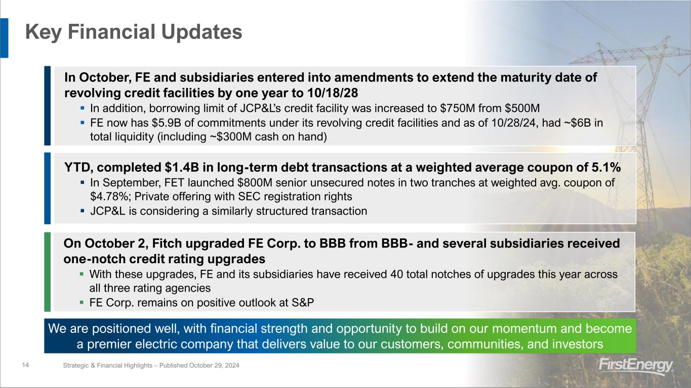 Economic & Customer Updates Strategic & Financial Highlights – Published October 29, 2024 Economic Trends Source: Moody’s Analytics & U.S Bureau of Economic Analysis 0% 1% 2% 3% 4% 5% 6% 2023Q3 2023Q4 2024Q1 2024Q2U n e m p lo y m e n t R a te Unemployment Rate OH PA NJ MD WV 0% 1% 2% 3% 4% 5% 6% 2023Q3 2023Q4 2024Q1 2024Q2 G ro s s D o m e s ti c ( S ta te ) P ro d u c t % GDP Growth OH PA NJ MD WV U.S. Avg. U.S. Avg. Positive GDP growth in all five states, with accelerating growth in OH & PA Unemployment rates in FE states are generally in-line with US average Well-positioned to serve customers; our investment program will adjust as needed to ensure capacity and reliable service Weather- Adjusted Customer Load Trends -1.4% -0.7% -0.6% 0.0% -0.1% 0.2% 2.1% 2.5% 2.5% 0.2% 0.6% 0.7% 3Q24 YTD24 TTM Res Com Ind Total 13