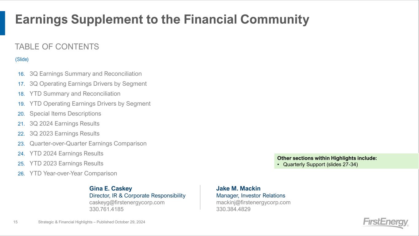 Earnings Supplement to the Financial Community 16. 3Q Earnings Summary and Reconciliation 17. 3Q Operating Earnings Drivers by Segment 18. YTD Summary and Reconciliation 19. YTD Operating Earnings Drivers by Segment 20. Special Items Descriptions 21. 3Q 2024 Earnings Results 22. 3Q 2023 Earnings Results 23. Quarter-over-Quarter Earnings Comparison 24. YTD 2024 Earnings Results 25. YTD 2023 Earnings Results 26. YTD Year-over-Year Comparison TABLE OF CONTENTS (Slide) Gina E. Caskey Director, IR & Corporate Responsibility caskeyg@firstenergycorp.com 330.761.4185 Jake M. Mackin Manager, Investor Relations mackinj@firstenergycorp.com 330.384.4829 Other sections within Highlights include: • Quarterly Support (slides 27-34) Strategic & Financial Highlights – Published October 29, 202415