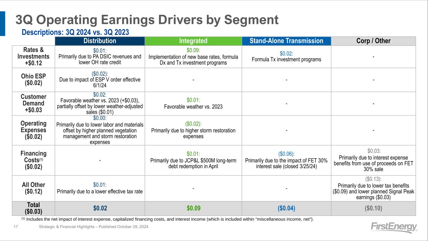 3Q Earnings Summary and Reconciliation Strategic & Financial Highlights – Published October 29, 2024 EPS Variance Analysis Stand-Alone Corporate / FirstEnergy Corp. (in millions, except per share amounts) Distribution Integrated Transmission Other Consolidated 3Q 2023 Earnings (Loss) Attributable to FirstEnergy Corp. from Continuing Operations - GAAP $175 $145 $100 $1 $421 3Q 2023 Basic Earnings Per Share from Continuing Operations - GAAP (avg. shares outstanding 573M) $0.31 $0.25 $0.17 $0.01 $0.74 Special Items - 2023 Enhanced employee retirement and other related costs 0.04 0.03 — — 0.07 Exit of generation — — — 0.01 0.01 FE Forward costs to achieve — — — 0.01 0.01 Investigation and other related costs — — — 0.03 0.03 Regulatory charges 0.02 — — — 0.02 Total Special Items - 3Q 2023 0.06 0.03 — 0.05 0.14 3Q 2023 Operating Earnings Per Share - Non-GAAP $0.37 $0.28 $0.17 $0.06 $0.88 Rates & Investments 0.01 0.09 0.02 — 0.12 Ohio ESP (0.02) — — — (0.02) Customer Demand 0.02 0.01 — — 0.03 Operating Expenses — (0.02) — — (0.02) Financing Costs — 0.01 (0.06) 0.03 (0.02) All Other 0.01 — — (0.13) (0.12) 3Q 2024 Operating Earnings (Loss) Per Share - Non-GAAP $0.39 $0.37 $0.13 $(0.04) $0.85 Special Items - 2024 Enhanced employee retirement and other related costs (0.01) — — — (0.01) FE Forward costs to achieve (0.04) (0.03) (0.01) — (0.08) Investigation and other related costs — — — (0.03) (0.03) Total Special Items - 3Q 2024 (0.05) (0.03) (0.01) (0.03) (0.12) 3Q 2024 Basic Earnings Per Share (Loss) from Continuing Operations - GAAP (avg. shares outstanding 576M) $0.34 $0.34 $0.12 $(0.07) $0.73 3Q 2024 Earnings (Loss) Attributable to FirstEnergy Corp. from Continuing Operations - GAAP $193 $197 $72 $(43) $419 Per share amounts for the special items and earnings drivers above and throughout this report are based on the after-tax effect of each item divided by the number of shares outstanding for the period. The current and deferred income tax effect was calculated by applying the subsidiaries' statutory tax rate to the pre-tax amount if deductible/taxable. The income tax rates range from 21% to 29% in the third quarter of 2024 and 2023. Quarterly Summary Quarterly Reconciliation 3Q 2024 3Q 2023 Change GAAP Earnings Per Basic Share from Continuing Operations $0.73 $0.74 $(0.01) Special Items $0.12 $0.14 $(0.02) Operating (Non-GAAP) Earnings Per Share $0.85 $0.88 $(0.03) Note: Refer to slide 3 for information on Non-GAAP Financial Matters. 16