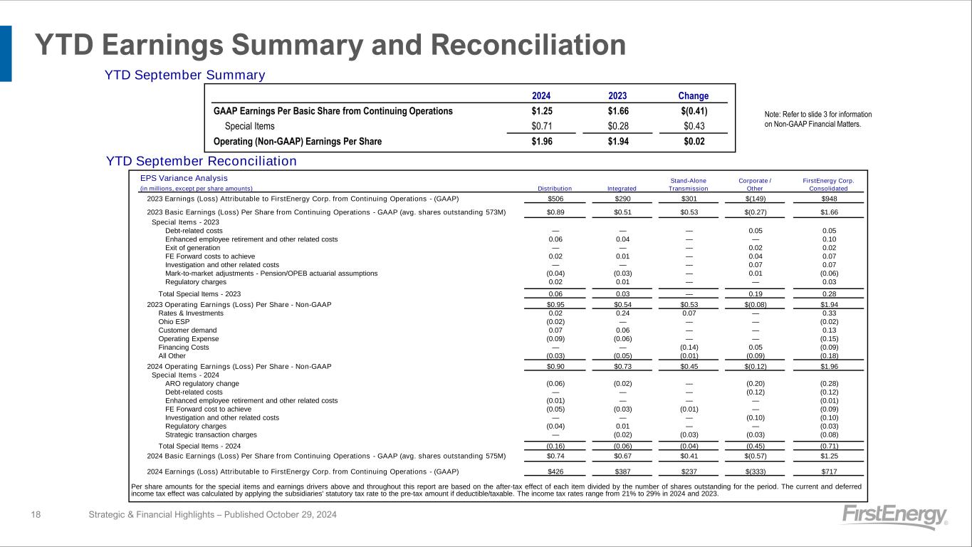 YTD 2024 Earnings Results Strategic & Financial Highlights – Published October 29, 2024 YTD September 2024 (in millions, except for per share amounts) GAAP Special Items Operating (Non-GAAP) Dx Int Tx Corp FE Dx Int Tx Corp FE Dx Int Tx Corp FE (1) Electric sales $ 5,110 $ 3,676 $ 1,367 $ 6 $10,159 $ — $ — $ — $ — $ — $ 5,110 $ 3,676 $ 1,367 $ 6 $ 10,159 (2) Other 122 49 14 (48) 137 — — — — — 122 49 14 (48) 137 (3) Total Revenues 5,232 3,725 1,381 (42) 10,296 — — — — — 5,232 3,725 1,381 (42) 10,296 (4) Fuel — 372 — — 372 — — — — — — 372 — — 372 (5) Purchased power 1,723 1,260 — 16 2,999 — — — — — 1,723 1,260 — 16 2,999 (6) Other operating expenses 1,871 1,041 280 83 3,275 (121) (a)(d)(f) (93) (a)(d)(f) (11) (d) (185) (a)(d)(e) (410) 1,750 948 269 (102) 2,865 (7) Provision for depreciation 486 386 249 57 1,178 (3) (d) (1) (d) — (1) (a) (5) 483 385 249 56 1,173 (8) Amortization (deferral) of regulatory assets, net (152) (58) 5 — (205) — 61 (f) — — 61 (152) 3 5 — (144) (9) General taxes 569 104 209 33 915 (1) (d) (1) (d) — — (2) 568 103 209 33 913 (10) Total Operating Expenses 4,497 3,105 743 189 8,534 (125) (34) (11) (186) (356) 4,372 3,071 732 3 8,178 (11) Debt redemption costs — — — (85) (85) — — — 85 (b) 85 — — — — — (12) Equity method investment earnings — — — 64 64 — — — — — — — — 64 64 (13) Miscellaneous income, net 101 39 12 4 156 — — — — — 101 39 12 4 156 (14) Interest expense (331) (198) (201) (136) (866) — — — 3 (b) 3 (331) (198) (201) (133) (863) (15) Capitalized financing costs 17 33 43 1 94 — — — — — 17 33 43 1 94 (16) Total Other Expense (213) (126) (146) (152) (637) — — — 88 88 (213) (126) (146) (64) (549) (17) Income taxes (benefits) 96 107 141 (50) 294 31 (a)(d)(f) 3 (a)(d)(f)(g) (21) (g) 13 (a)(b)(d)(e)(g) 26 127 110 120 (37) 320 (18) Income attributable to noncontrolling interest — — 114 — 114 — — 9 (d)(g) — 9 — — 123 — 123 (19) Earnings (Loss) Attributable to FE Corp. from Continuing Operations $ 426 $ 387 $ 237 $ (333) $ 717 $ 94 $ 31 $ 23 $ 261 $ 409 $ 520 $ 418 $ 260 $ (72) $ 1,126 (20) Average Shares Outstanding 575 575 575 (21) Earnings (Loss) per Share $ 0.74 $ 0.67 $ 0.41 $ (0.57) $ 1.25 $ 0.16 $ 0.06 $ 0.04 $ 0.45 $ 0.71 $ 0.90 $ 0.73 $ 0.45 $ (0.12) $ 1.96 Special Items (after-tax impact): (a) (a) ARO regulatory change $ 35 $ 12 $ — $ 115 $ 162 (b) (b) Debt-related costs — — — 69 69 (c) (c) Enhanced employee retirement and other related costs 3 2 — — 5 (d) (d) FE Forward cost to achieve 31 16 4 3 54 (e) (e) Investigation and other related costs — — — 54 54 (f) (f) Regulatory charges 25 (7) — — 18 (g) (g) Strategic transaction charges — 8 19 20 47 Impact to Earnings $ 94 $ 31 $ 23 $ 261 $ 409 24