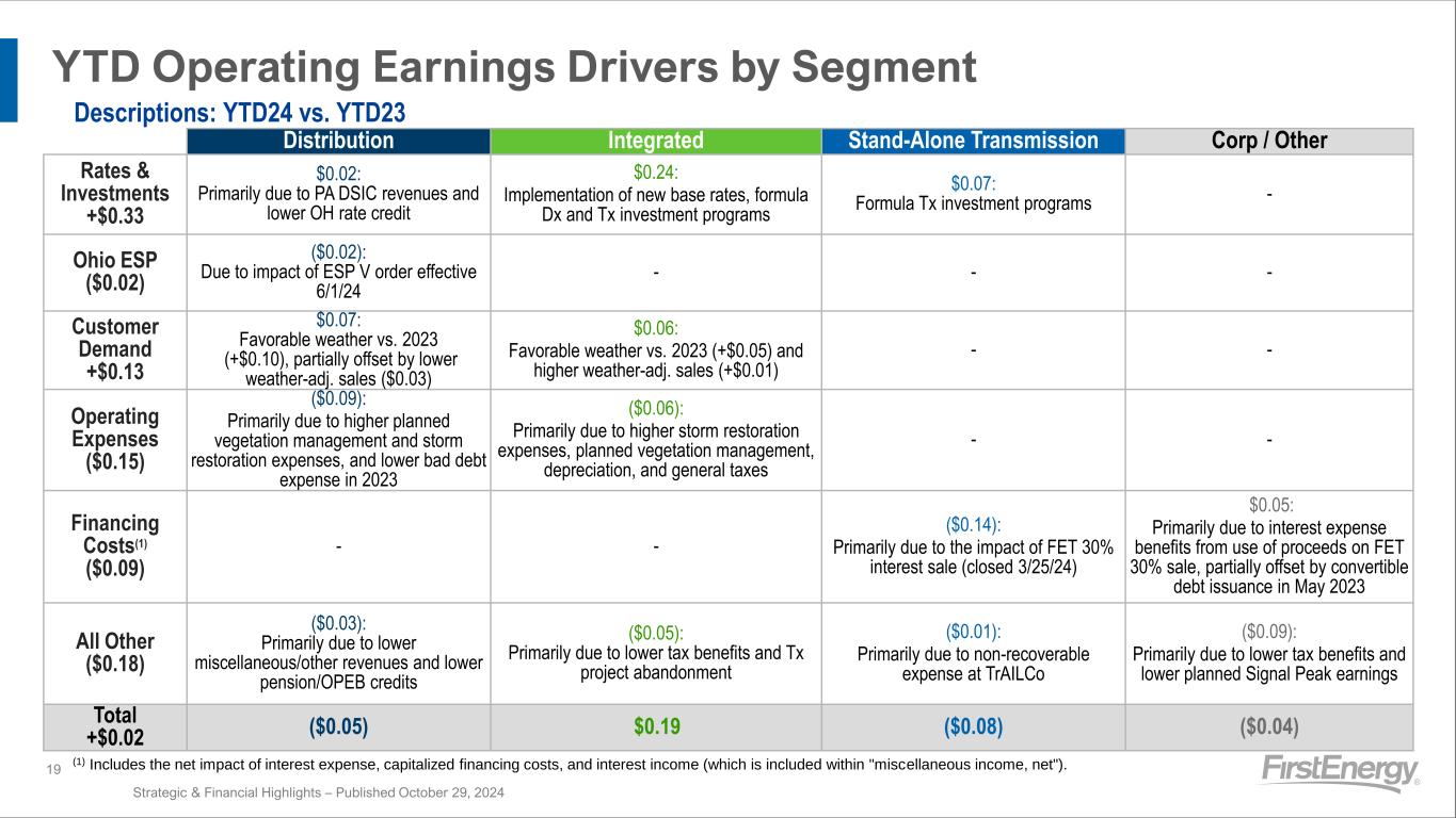 YTD Earnings Summary and Reconciliation Strategic & Financial Highlights – Published October 29, 2024 Strategic & Financial Highlights – Published October 29, 2024 EPS Variance Analysis Stand-Alone Corporate / FirstEnergy Corp. (in millions, except per share amounts) Distribution Integrated Transmission Other Consolidated 2023 Earnings (Loss) Attributable to FirstEnergy Corp. from Continuing Operations - (GAAP) $506 $290 $301 $(149) $948 2023 Basic Earnings (Loss) Per Share from Continuing Operations - GAAP (avg. shares outstanding 573M) $0.89 $0.51 $0.53 $(0.27) $1.66 Special Items - 2023 Debt-related costs — — — 0.05 0.05 Enhanced employee retirement and other related costs 0.06 0.04 — — 0.10 Exit of generation — — — 0.02 0.02 FE Forward costs to achieve 0.02 0.01 — 0.04 0.07 Investigation and other related costs — — — 0.07 0.07 Mark-to-market adjustments - Pension/OPEB actuarial assumptions (0.04) (0.03) — 0.01 (0.06) Regulatory charges 0.02 0.01 — — 0.03 Total Special Items - 2023 0.06 0.03 — 0.19 0.28 2023 Operating Earnings (Loss) Per Share - Non-GAAP $0.95 $0.54 $0.53 $(0.08) $1.94 Rates & Investments 0.02 0.24 0.07 — 0.33 Ohio ESP (0.02) — — — (0.02) Customer demand 0.07 0.06 — — 0.13 Operating Expense (0.09) (0.06) — — (0.15) Financing Costs — — (0.14) 0.05 (0.09) All Other (0.03) (0.05) (0.01) (0.09) (0.18) 2024 Operating Earnings (Loss) Per Share - Non-GAAP $0.90 $0.73 $0.45 $(0.12) $1.96 Special Items - 2024 ARO regulatory change (0.06) (0.02) — (0.20) (0.28) Debt-related costs — — — (0.12) (0.12) Enhanced employee retirement and other related costs (0.01) — — — (0.01) FE Forward cost to achieve (0.05) (0.03) (0.01) — (0.09) Investigation and other related costs — — — (0.10) (0.10) Regulatory charges (0.04) 0.01 — — (0.03) Strategic transaction charges — (0.02) (0.03) (0.03) (0.08) Total Special Items - 2024 (0.16) (0.06) (0.04) (0.45) (0.71) 2024 Basic Earnings (Loss) Per Share from Continuing Operations - GAAP (avg. shares outstanding 575M) $0.74 $0.67 $0.41 $(0.57) $1.25 2024 Earnings (Loss) Attributable to FirstEnergy Corp. from Continuing Operations - (GAAP) $426 $387 $237 $(333) $717 Per share amounts for the special items and earnings drivers above and throughout this report are based on the after-tax effect of each item divided by the number of shares outstanding for the period. The current and deferred income tax effect was calculated by applying the subsidiaries' statutory tax rate to the pre-tax amount if deductible/taxable. The income tax rates range from 21% to 29% in 2024 and 2023. YTD September Summary YTD September Reconciliation 2024 2023 Change GAAP Earnings Per Basic Share from Continuing Operations $1.25 $1.66 $(0.41) Special Items $0.71 $0.28 $0.43 Operating (Non-GAAP) Earnings Per Share $1.96 $1.94 $0.02 Note: Refer to slide 3 for information on Non-GAAP Financial Matters. 18